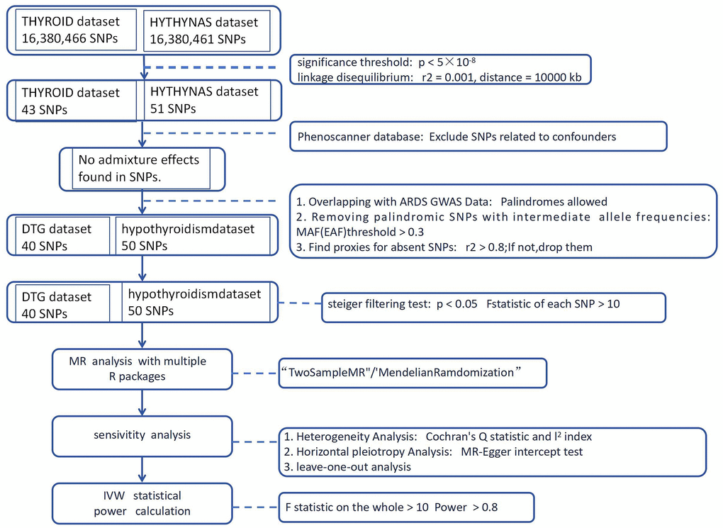 To estimate causal effects, genetic variants were extracted as instrumental variables (IVs) based on following hypotheses: (1) predictive of hypothyroidism and DTG, (2) unaffected by confounding factors, and (3) not influenced ARDS through another pathway except hypothyroidism and DTG. It is quite important that these principles are firstly met.