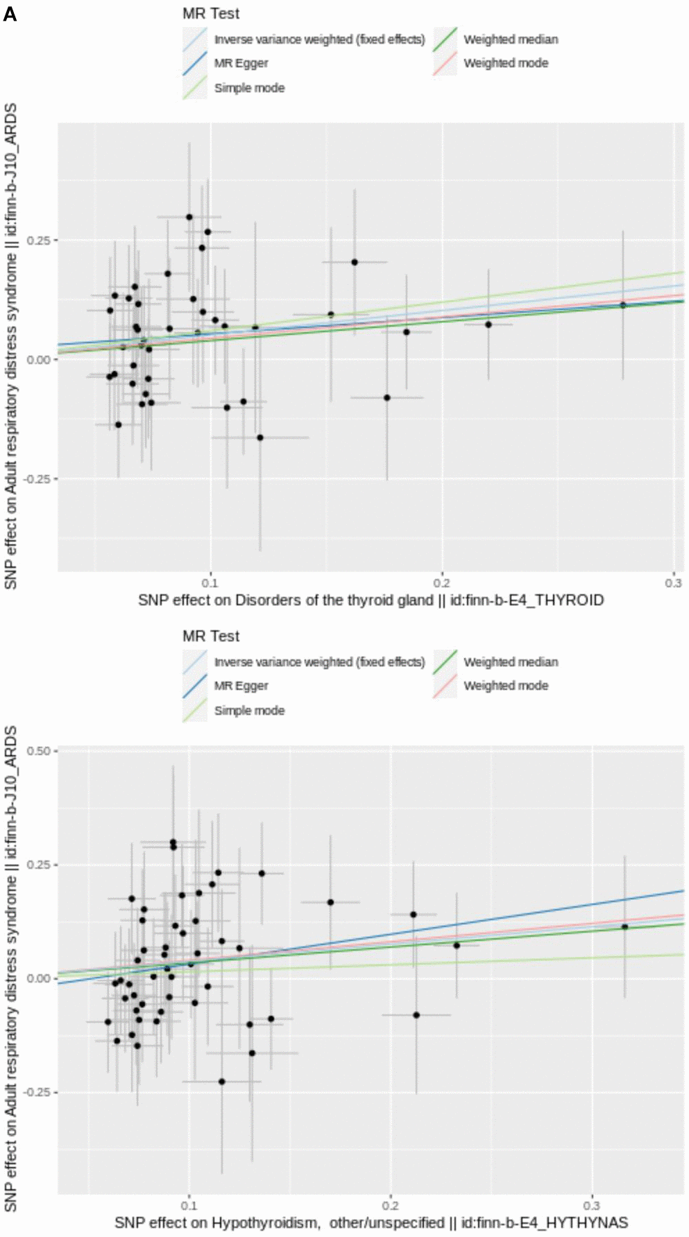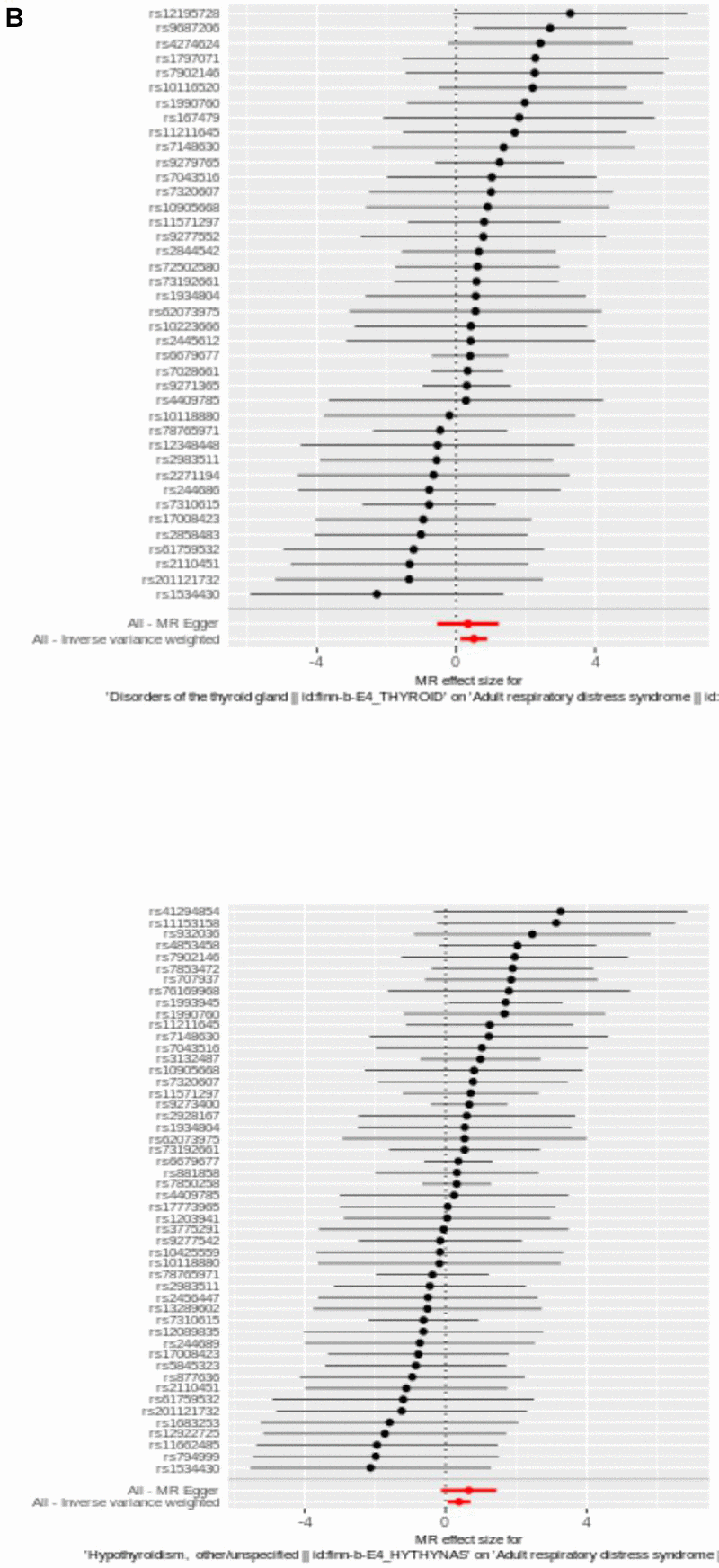 Harmonise effect equivalents and sizes were performed by harmonise data in TwoSampleMR package. MR analysis was conducted with MR-Egger [14], Weighted median [15], Inverse variance weighted (IVW) [16], Simple mode [17] and Weighted mode [18], and the primary analysis was performed using IVW. Odds Ratio (OR) was then calculated. Exposure factors with OR > 1 were risk factors and OR < 1 were protective factors. MVMR analysis was conducted to explore combined effect of hypothyroidism and DTG on ARDS.