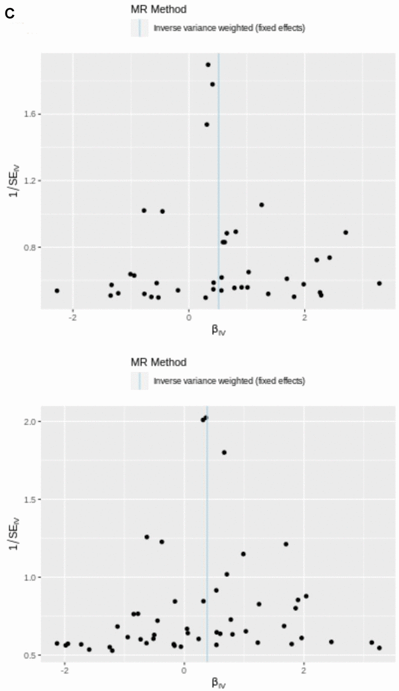 () The utilization of a funnel plot. The utilization of a funnel plot as a means to assess the robustness of a study is being considered. The dispersed data points represent the approximate impact of a solitary SNP employed as an IV. Global estimate was depicted by the vertical lines, which were obtained using IVW approach using MR-Egger regression.