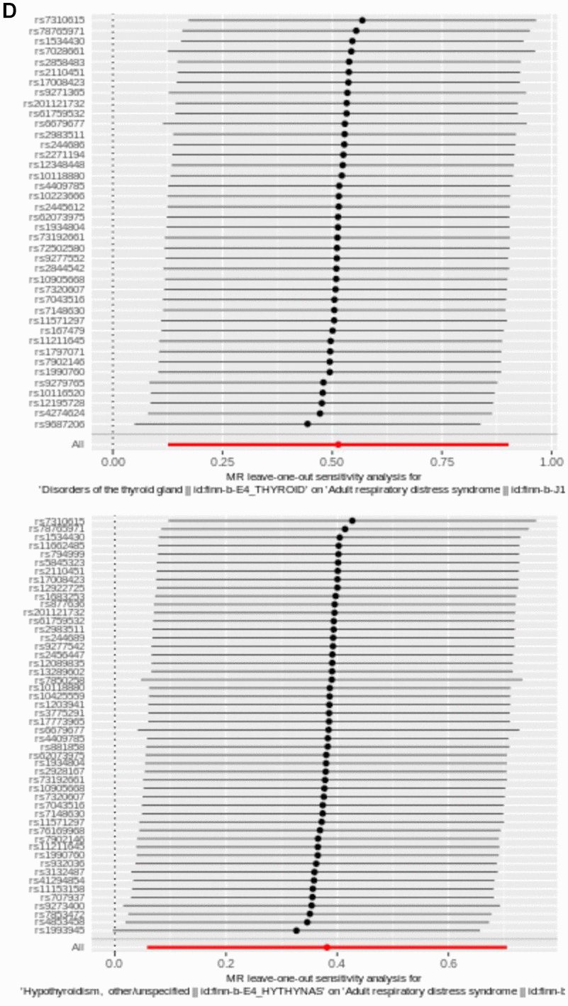 To lower the bias produced by horizontal pleiotropy, MR-Egger intercept test following a linear model was further performed (hypothyroidism: p = 0.108 > 0.05, DTG: p = 0.0.454 > 0.05). Visual results of all four methods were displayed in a scatter plot, with the intercept of MR-Egger regression model shown (Figure 2A). The Figures showed the essentially symmetrical distribution in the two main MR approaches of increased genetic effect estimates of DTG and hypothyroidism on ARDS risk when a single SNP was employed as IV. However, statistical power of this study was relatively insufficient, which might be caused by deficiency of the case size.