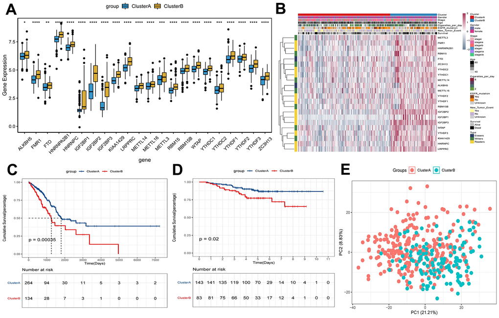 In the process of increasing the number of clusters K from 2 to 5, when K = 2, there is a higher intra-group correlation and a lower inter-group correlation (Supplementary Figure 1A–1E). Similar results were verified in GEO (Supplementary Figure 1F–1J). Thus, patients in TCGA were divided into clusterA (264 early-stage LUAD samples) and clusterB (134 early-stage LUAD samples) according to K=2. Moreover, verification in GEO also found similar results (clusterA contains 143 early-stage LUAD samples; clusterB contains 83 early-stage LUAD samples). The results of differential expression analysis showed that the expression levels of m6A methylation regulators in clusterB were higher than that in clusterA (Figure 2A). Then, the clinicopathological features between clusterA and clusterB were compared. The results showed that clusterB mainly contained male patients with early-stage LUAD and was associated with higher age and smoking frequency (Figure 2B). KM analysis in TCGA (Figure 2C) and GEO (Figure 2D) indicated that the survival time of patients in clusterB was significantly shorter than that in clusterA. We also used the PCA method to further analyze the gene expression patterns of clusterA and clusterB. Gene expression profiles between clusterA and clusterB were well distinguished (Figure 2E). Our data showed that the cluster subtypes defined by the expression of the m6A regulators were closely related to the heterogeneity of early-stage LUAD patients.