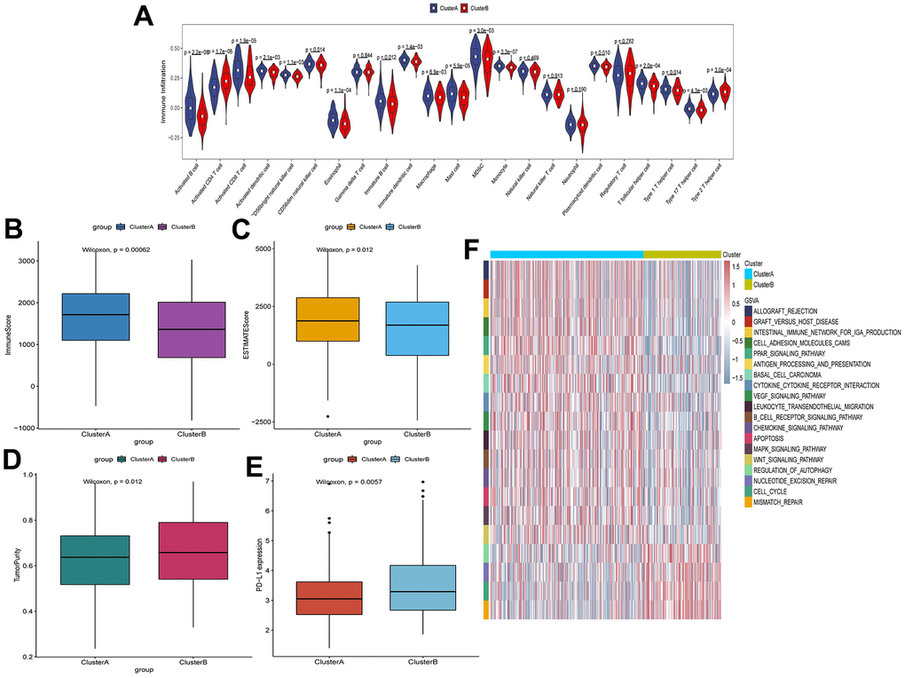 To investigate the degree of immune cell infiltration in TIME of clusterA and clusterB, we performed the ssGSEA analysis. The degree of immune cell (for example, Activated CD8 T cell and Immature B cell) infiltration in TIME was significantly reduced in clusterB (Figure 3A). Moreover, the immune and ESTIMATE scores were significantly lower in clusterB subtype than in clusterA subtype, and the tumor purity was significantly higher (Figure 3B–3D). We also detected the expression of PD-L1 in clusterA and clusterB. The expression of PD-L1 in clusterA was significantly higher than that in clusterB (Figure 3E). In addition, GSVA results showed that pathways (cell adhesion molecules, PPAR signaling pathway and B cell receptor signaling pathway) related to immunity and inhibition of tumor progression were significantly enriched in clusterA compared with clusterB (Figure 3F).