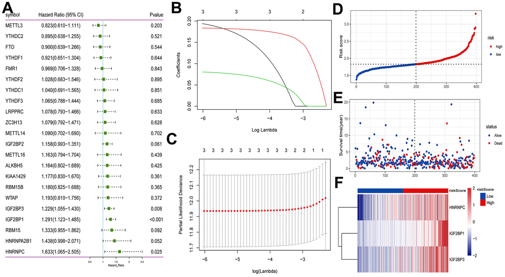 Univariate Cox analysis showed that 3 m6A regulators (HNRNPC, IGF2BP1 and IGF2BP3) were significantly associated with the prognosis of early-stage LUAD (Figure 4A). We performed LASSO-Cox regression analysis for the 3 characteristic genes. A prognostic model consisting of HNRNPC, IGF2BP1 and IGF2BP3 was constructed (Figure 4B, 4C). Risk Score = (0.1940*HNRNPC) + (0.1836*IGF2BP1) + (0.0805*IGF2BP3). Subsequently, the patients were categorized into high and low risk groups. The survival time of patients in high risk group was lower (Figure 4D, 4E). The results of heat map indicated that HNRNPC, IGF2BP1 and IGF2BP3 were lowly expressed in the lower risk group (Figure 4F). Drugs related to HNRNPC, IGF2BP1 and IGF2BP3 were screened based on DGIdb database (https://dgidb.org/). The results showed that only one drug DABIGATRAN related to HNRNPC was screened (Supplementary Figure 2).