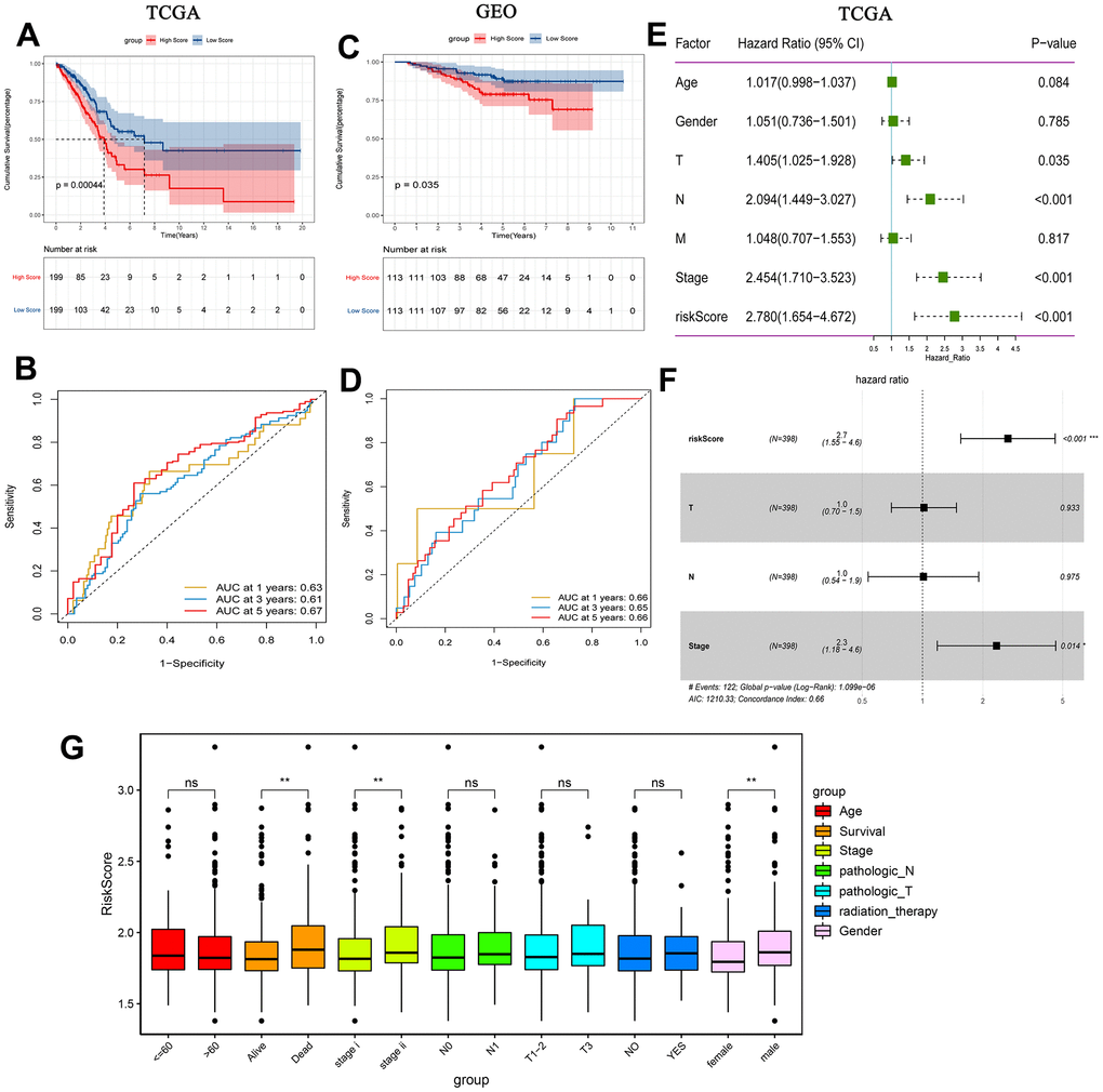 Additionally, patients in the high-risk group had a lower survival time, according to the KM analysis (Figure 5A). ROC curve analyses results showed that the AUC in 1, 3 and 5 years were all greater than 0.6 (Figure 5B). The results of KM analysis and ROC analysis in GEO (Figure 5C, 5D) and cBioPortal (https://www.cbioportal.org/) (Supplementary Figure 3A, 3B) databases are similar to those in TCGA. Decision curve analysis (DCA) was also performed based on TCGA. Prognostic indicator genes TP53 and NPM1 for LUAD and risk score were selected to perform DCA (Supplementary Figure 3C). The results of DCA showed that the predictive effect of risk score was better. Univariate analysis showed that T stage, N stage, TNM stage and risk score were correlated with overall survival of early-stage LUAD (Figure 5E). Moreover, multivariate analysis showed that TNM stage, risk score and overall survival were significantly correlated (Figure 5F). Additionally, risk score was significantly associated with survival, stage and gender (Figure 5G). In summary, the risk score may be an independent prognostic factor for early-stage LUAD.