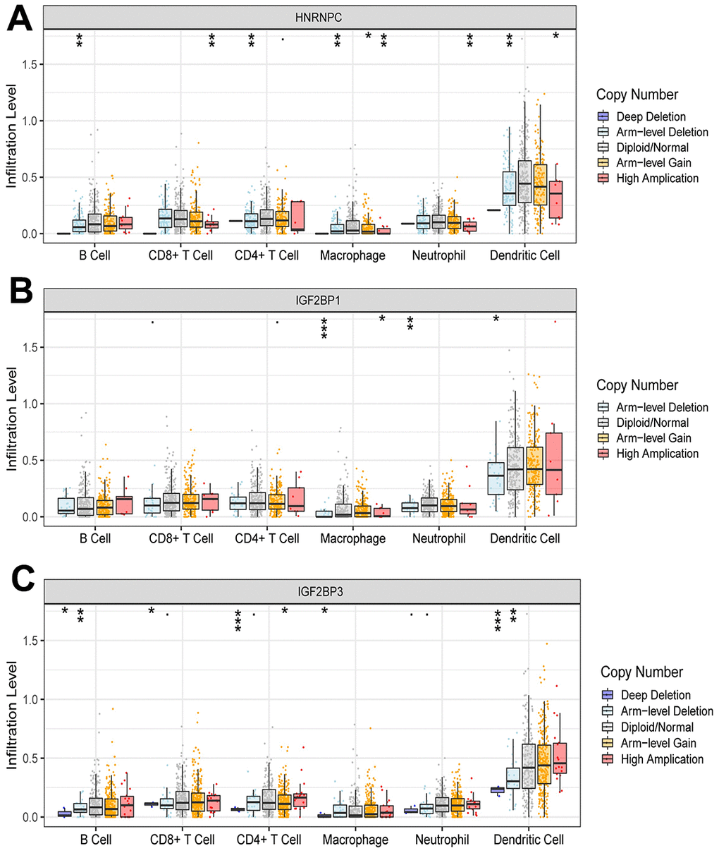 The risk score was negatively correlated with the infiltration level of activated B cell, activated CD8 T cell, macrophage, neutrophil and plasmacytoid dendritic cell, and positively correlated with the infiltration level of activated CD4 T cell (Figure 6). This result confirmed that risk score based on HNRNPC, IGF2BP1 and IGF2BP3 was associated with the immune microenvironment of early-stage LUAD. Subsequently, we assessed the effect of CNAs of HNRNPC, IGF2BP1 and IGF2BP3 on the infiltration of immune cell. Somatic cell CNAs could affect the infiltration of immune cells (Figure 7).