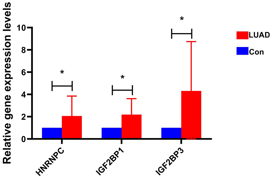 Primers of HNRNPC, IGF2BP1 and IGF2BP3 are shown in Supplementary Table 3. Expression levels of HNRNPC, IGF2BP1 and IGF2BP3 were significantly up-regulated in early-stage LUAD tissues compared with adjacent normal tissues (Figure 8). This result was consistent with bioinformatics analysis. This further indicates that HNRNPC, IGF2BP1 and IGF2BP3 may play important regulatory roles in the pathological mechanism of early-stage LUAD.