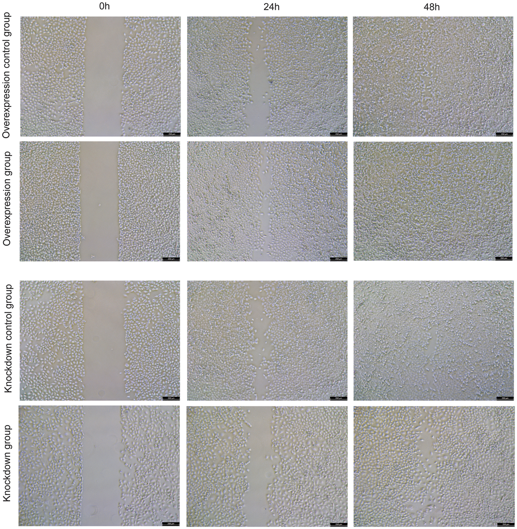 Cell line NCI-H1299 (Procell, CL-0165) was used for cell validation. The model gene HNRNPC was selected for knockdown and overexpression in NCI-H1299 cells. Overexpression lentivirus (vector: GV492) and target gene RNA interference lentivirus (vector: GV493) were purchased from Shanghai Jikai Gene Technology Co. The effect of HNRNPC on the migration of NCI-H1299 cells was analyzed by cell scratch assay. The cell density of knockdown control group, knockdown group, overexpression control group and overexpression group was adjusted to 2×105 cells/well and seeded in 6-well plate, with 3 replicates in each group, and incubated at 37° C, 5% CO2. After the cells had grown to a monolayer, scratches were made with the micro pipette tip, and washed gently twice with phosphate buffer saline (PBS) to remove the scratched cells. After that, the culture was continued, and samples were taken and photographed according to the culture time of 0h, 24h and 48h. In addition, the effect of HNRNPC on the migration and invasion of NCI-H1299 cells was detected by Transwell assay. For Transwell assay, the cell density was adjusted to 4×104 cells/well and seeded in 24-well plates. Cells on the bottom surface of the Transwell chamber were fixed with precooled ethanol for 30 min. Crystal violet solution was stained for 30 min and observed under a microscope.