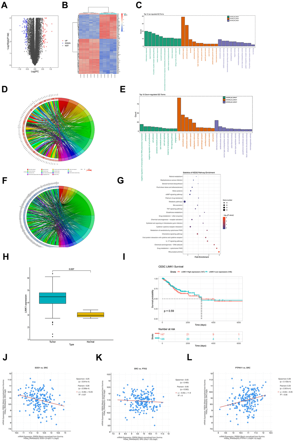 Downloaded the cervical cancer TCGA dataset CESC from UCSC Xena (https://xenabrowser.net/), which includes datasets of disease and normal tissues, downloaded clinical datasets, and performed analysis using R language (version 4.1.3). Drawn box plots for disease and normal tissue expression (Figure 1H), from which it can be seen that LIMK1 is highly expressed in cancerous tissues (p<0.05). Combined with clinical data, drawn the overall survival (OS) curve of LIMK1 (Figure 1I), from which it can be concluded that LIMK1 has a short survival period.