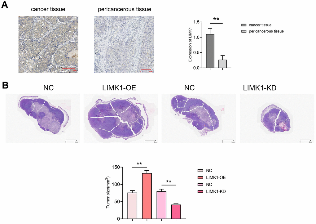 First, we used immunohistochemical staining to detect the expression of LIMK1 in cancer and pericancerous tissues of human cervical cancer. The results showed that the relative protein expression of LIMK1 in cancer tissues (1.11±0.19) was significantly higher than that in pericancerous tissues (0.27±0.14). The results of tumor-bearing experiments and HE staining in nude mice showed that compared with the NC group (76.36±5.97), the tumor slice area of the LIMK1-OE group (132.8±7.44) increased significantly. Compared with the NC group (80.03±6.24), the tumor slice area of the LIMK1-KD group (41.56±3.84) was significantly reduced (Figure 2). These results suggest that LIMK1 can promote the occurrence and development of cervical cancer.