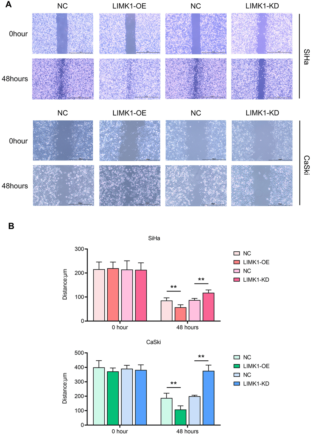To investigate the effect of LIMK1 on the migration and invasion ability of cervical cancer cells, the results of cell scratch assay showed that at 48 h, the scratch spacing between SiHa cells and CaSki cells in the LIMK1-OE group was significantly lower than that of the NC group, and the spacing between SiHa cells and CaSki cells in the LIMK1-KD group was significantly higher than that of the NC group (Figure 3). The results of Transwell assay showed that the number of migration and invasion of SiHa cells and CaSki cells in the LIMK1-OE group was significantly higher than that of the NC group, and the number of migration and invasion of SiHa cells and CaSki cells in the LIMK1-KD group was significantly lower than that of the NC group (Figure 4). The above data proved that LIMK1 can promote the migration and invasion of cervical cancer cells.
