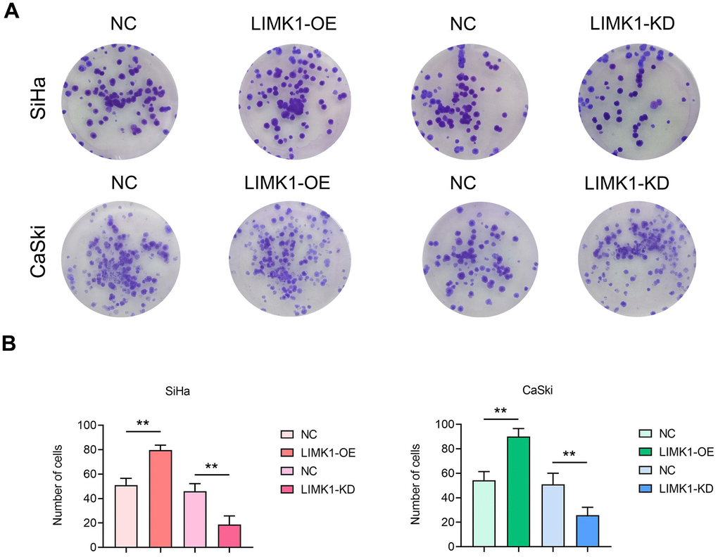 To investigate the effect of LIMK1 on the proliferation ability of cervical cancer cells. The results of clone formation experiment showed that the number of clones of SiHa cells and CaSki cells in the LIMK1-OE group was significantly higher than that of the NC group. Compared with the NC group, the number of clones of SiHa cells and CaSki cells in the LIMK1-KD group was significantly reduced (Figure 5).