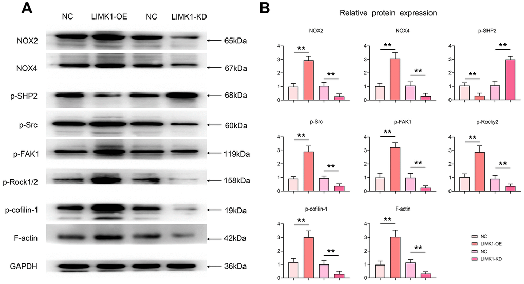 The transfected cells were lysed using RIPA lysis buffer and the protein concentration was measured with the BCA kit. Protein was isolated by SDS-PAGE (protein loading concentration was 4 μg), the gel was transferred with PVDF membrane, and sealed with 5% skim milk (2 h) at 25° C. The membrane was incubated with LIMK1 (1,000; Abcam, UK), NOX2 (1:1,000; Abcam), NOX4 (1:1,000; Abcam), p-Src (1:1,000; Abcam), p-FAK (1:1,000; Abcam), p-ROCK1/2 (1:1,000; Abcam), p-Cofilin-1 (1:1,000; Abcam), p-SHP-2, GAPDH (1:1,000; Abcam) primary antibodies at 4° C overnight. After washing with TBST, the membrane and the secondary antibody were incubated at room temperature for one hour. Luminescence was done using ECL substrate kit.