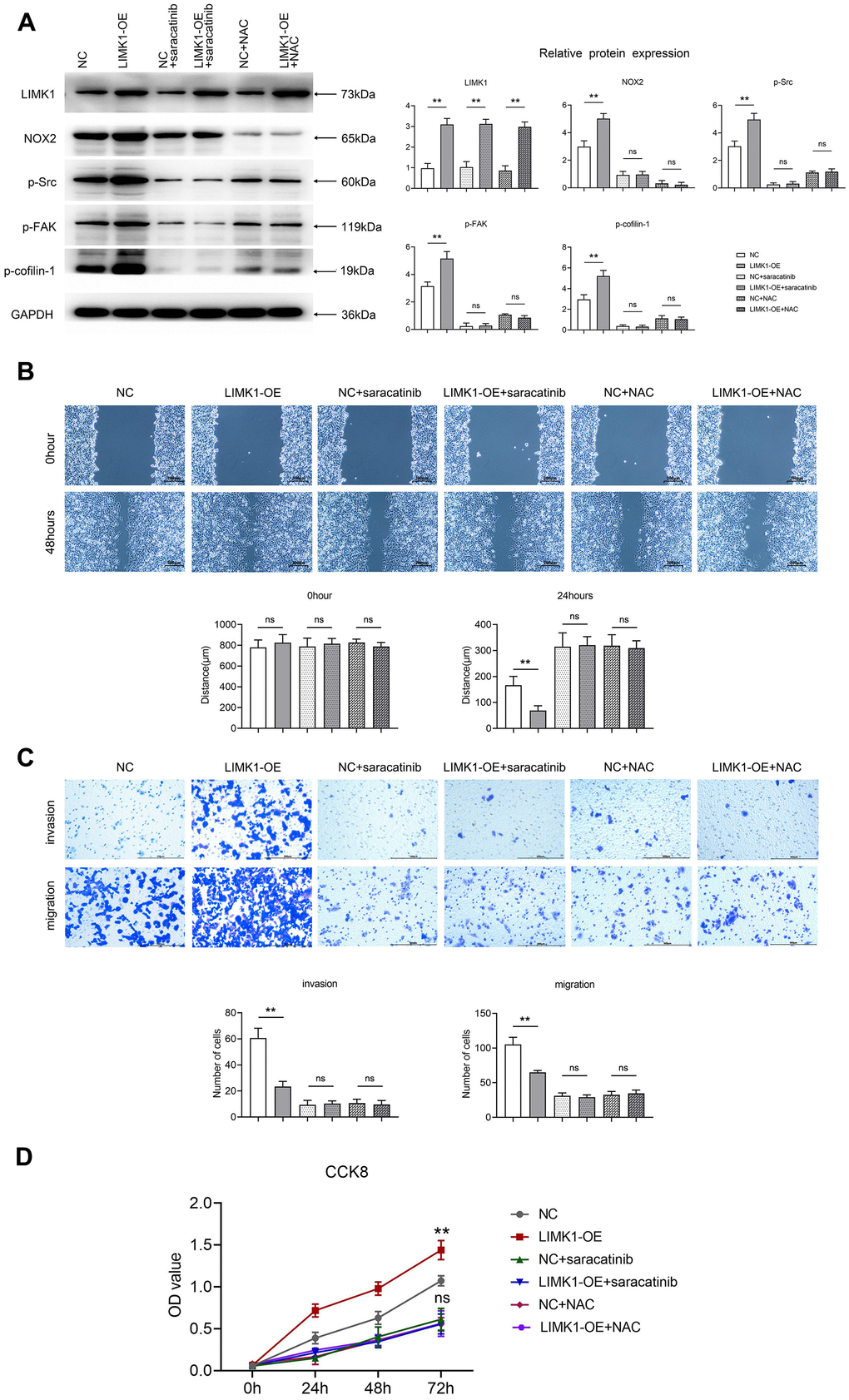 Through the culture of cervical cancer cells by ROS inhibitor NAC and Src inhibitor Saracatinib, we performed correction experiments. Western blotting results showed that the relative protein expression of LIMK1, NOX2, p-Src, p-FAK and p-Cofilin-1 was significantly higher in the LIMK1-OE group relative to the NC group. After the addition of NAC and Saracatinib to the NC and LIMK1-OE groups, respectively, the relative protein expression of NOX2, p-Src, p-FAK and p-Cofilin-1 in the NC and LIMK1-OE groups was significantly reduced and significant differences were eliminated, except for LIMK1 (Figure 7A).