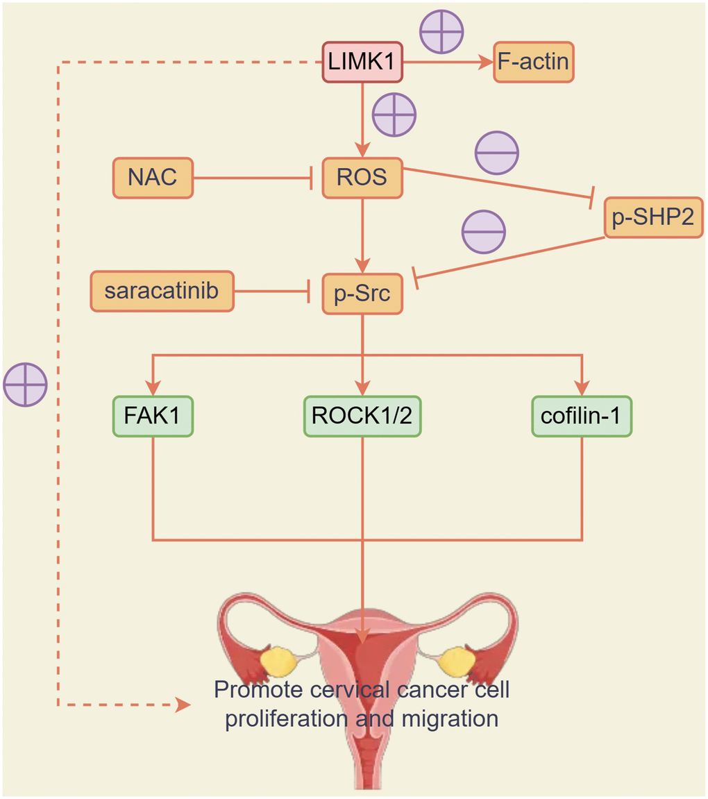 LIMK1 is a serine protease, which is highly expressed in many tumors and is closely related to the occurrence, development, and metastasis of tumors [5–7]. In this study, we explored the mechanism of action of LIMK1 in cervical cancer progression. At present, there have been some studies on the role of LIMK1 in cervical cancer [8–10]. Studies have shown that the expression level of LIMK1 in cervical cancer tissues is significantly higher than that in normal tissues, and it is closely related to the stage, grade, and prognosis of cervical cancer [10]. Therefore, we speculate that LIMK1 plays an important role in the occurrence and development of cervical cancer. In addition, oxidative stress also plays an important role in the occurrence and development of cervical cancer [11, 12]. Studies have shown that oxidative stress can activate tumor signal transduction, enhance cell survival and proliferation, and drive DNA damage and genetic instability [13]. Studies have shown that the level of reactive oxygen species (ROS) in cervical cancer tissues is significantly higher than that in normal tissues, and the excessive production of ROS is closely related to the progression, metastasis, and prognosis of cervical cancer. At the same time, Src, as a non-receptor tyrosine kinase, is closely associated with ROS [14]. The studies by Takagane et al. showed that the interaction between SHP-2 and Src reduces the activation of SHP-2 [15]. Meanwhile, Jo et al. showed that SHP-2 can inhibit the activity of Src under oxidative stress [16]. FAK-Src promotes the invasion and migration of multiple cancers [17–19]. ROCK and cofilin-1 are the predictive therapeutic targets for the proliferation and metastasis of multiple tumors [20, 21].