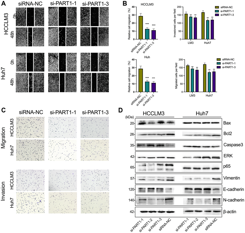 To elucidate the role of PART1 in HCC cell migration, invasion, and metastasis, wound healing, Transwells, and epithelial-mesenchymal transition (EMT)-related marker assays were performed. Wound healing assays showed a significant reduction in wound closure in HCCLM3 and Huh7 cells transfected with si-PART1 compared to the siRNA-NC group, indicating that PART1 knockdown significantly inhibited the migration of HCC cells (Figure 3A, 3B). Furthermore, the Transwell assay showed that the depletion of PART1 in HCCLM3 and Huh7 cells substantially hindered cell migration and invasion (Figure 3B, 3C). EMT activation is considered to be a critical process closely associated with cancer cell metastasis, during which epithelial cells acquire the characteristics of mesenchymal cells, with increased cell motility and migration capacity [37]. EMT is typically characterized by the upregulation of N-cadherin and Vimentin, followed by the downregulation of E-cadherin. As shown in Figure 3D, E-cadherin was significantly upregulated at the translational level in HCCLM and Huh7 cells transfected with si-PART1 compared to the siRNA-NC group, whereas N-cadherin and Vimentin were significantly downregulated. These results suggest that PART1 overexpression promotes the migration, invasion, and metastasis of HCC cells.