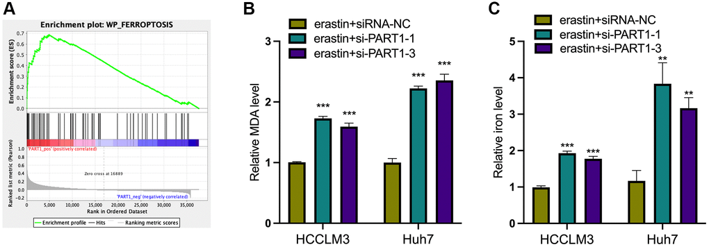 Because ferroptosis is characterized by the accumulation of intracellular iron and lipid reactive oxygen species (ROS), to clarify the role of PART1 in ferroptosis in HCC cells, the lipid peroxidation marker MDA and intracellular iron were detected in erastin-induced ferroptosis. Erastin is a classical inducer of ferroptosis that blocks the entry of extracellular cysteine into the cell by inhibiting system xc- activity, which in turn blocks the synthesis of intracellular GSH and weakens the antioxidant capacity of the cell, ultimately leading to the onset of ferroptosis. GSEA showed that PART1 expression was positively correlated with the enrichment of the WP_Ferroptosis gene set (Figure 4A). Compared to the siRNA-NC group, HCCLM3 or Huh7 cells transfected with si-PART1 showed significantly increases in the levels of MDA and intracellular iron (Figure 4B, 4C), suggesting that PART1 may be involved in regulating erastin-induced ferroptosis.