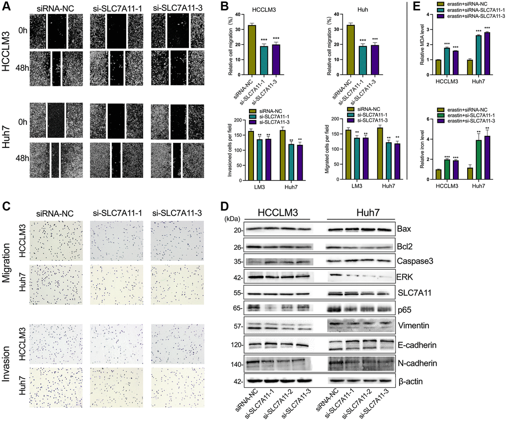 As mentioned above, PART1 may act as a ceRNA to regulate the expression of SLC7A11. To determine whether PART1 acts by regulating SLC7A11 expression, we first observed the effects of SLC7A11 knockdown on HCC cells. Compared to the negative control group, transient transfection of HCCLM3 and Huh7 cells with si-PART1 significantly reduced the expression of SLC7A11 at the transcript and translation levels (Figure 5A and Figure 6B). Transfection of HCCLM3 and Huh7 cells with si-SLC7A11 to reduce SLC7A11 expression significantly decreased cell viability, inhibited cell proliferation, attenuated migration and invasion, and increased apoptosis compared to the negative control group (Figure 5B–5D and Figure 6A–6C). Furthermore, impaired cell motility and increased apoptosis were verified by Western blotting. As shown in Figure 6D, the apoptosis-related proteins Bax and caspase3 were upregulated, whereas Bcl2, p65, and ERK1/2 were downregulated. Furthermore, E-cadherin was upregulated, whereas N-cadherin and Vimentin were downregulated in HCCLM3 and Huh7 cells transfected with si-SLC7A11 compared to the negative control group (Figure 6D). The levels of intracellular MDA and iron were significantly increased in HCCLM3 and Huh7 cells transiently transfected with si-SLC7A11 compared to the control group (Figure 6E). These results suggest that PART1 overexpression enhances the malignant phenotype of HCC and inhibits ferroptosis by increasing SLC7A11 expression.
