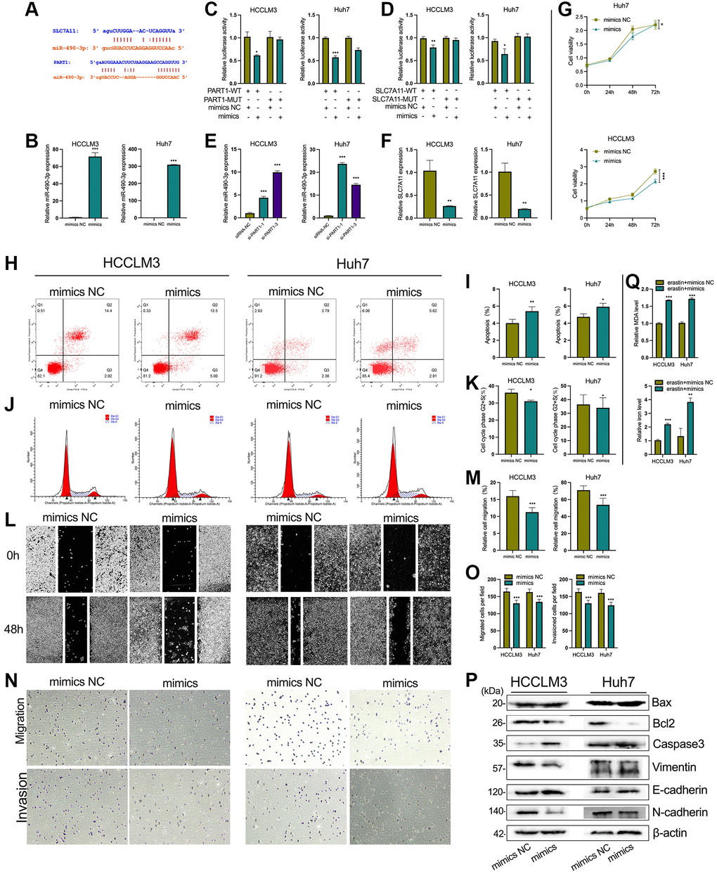 Mechanistically, bioinformatic predictions revealed that miR-490-3p can target both the PART1 and 3′-UTR of SLC7A11 mRNA (Figure 7A). As shown in Figure 7B, miR-490-3p expression was significantly upregulated when transfected with miR-490-3p mimics in HCCLM3 and Huh7 cells compared to the NC group. Next, dual luciferase reporter assays were performed to verify the predicted direct interactions between miR-490-3p and PART1 or SLC7A11. For the PART1/miR-490-3p interaction assay, miR-490-3p mimics (or mimics NC) and pmirGLO-PART1-WT (or -MUT) were co-transfected into HCCLM3 or Huh7. Compared to cells co-transfected with pmirGLO-PART1-WT and miR-490-3p mimics NC, the relative luciferase activity was significantly reduced in cells co-transfected with pmirGLO-PART1-WT and miR-490-3p mimics (Figure 7C). Similarly, the relative luciferase activity was significantly reduced in cells co-transfected with pmirGLO-SLC7A11-WT and miR-490-3p mimics compared to cells co-transfected with mimics NC (Figure 7D). These results indicate that miR-490-3p can directly interact with PART1 and SLC7A11. In addition, silencing PART1 in HCCLM3 and Huh7 cells significantly upregulated the expression of miR-490-3p while downregulating the expression of SLC7A11 (Figure 7E and Figure 5A). Meanwhile, miR-490-3p mimics significantly downregulated the expression of SLC7A11 (Figure 7F). The above results suggest that PART1 acts as an endogenous sponge for miR-490-3p in HCC cells to promote the expression of SLC7A11 and may promote HCC progression and inhibit ferroptosis through the miR-490-3p/SLC7A11 axis. The results of in vitro experiments showed that the upregulation of miR-490-3p expression in HCC cells by miR-490-3p mimics inhibited the cell proliferation of HCCLM3 and Huh7 cells (Figure 7G, 7J, 7K), induced apoptosis (Figure 7H, 7I), and enhanced the migration and invasive ability of HCC cells (Figure 7L–7O). Western blotting showed that the expression of Bax and caspase3 was significantly increased, while the anti-apoptotic factor Bcl2 was significantly decreased in the miR-490-3p mimics group compared to the mimics NC group (Figure 7P). Regarding the indicators of EMT, N-cadherin and Vimentin were significantly downregulated, while E-cadherin was upregulated in the miRNA-490-3p mimics group compared to the mimics NC group (Figure 7P). In addition, ROS and intracellular iron accumulated significantly in HCCLM3 and Huh7 cells transfected with miRNA-490-3p mimics (Figure 7Q).
