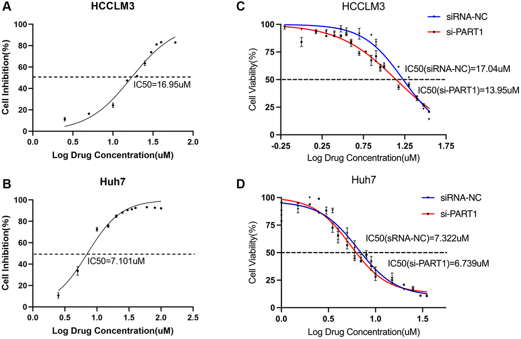 The sensitivity of HCC to sorafenib was determined using the CCK-8 assay (Glpbio, China, GK10001-30) according to the manufacturer’s instructions. Multiple concentrations of sorafenib were applied to HCC cells for 24 h to determine the IC50 values of HCCLM3 and Huh7. Then, siRNA-PART1 was transfected into the two HCC cell lines to silence PART1. The IC50 values were determined by the viability of the siRNA-PART1 and siRNA-NC cells under multiple concentrations of sorafenib intervention.
