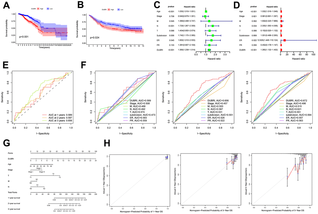 Univariate and multivariate Cox regression analyses were performed to determine whether DUBRI could serve as an independent prognostic factor in breast cancer patients (Figure 1C, 1D). DUBRI had high accuracy in predicting 1-, 3-, and 5-year survival of breast cancer patients and was a better predictor of patient survival than other clinical traits (Figure 1E, 1F). Next, we used age, clinical stage, T, N, and M in the model to create column-line plots for breast cancer patients in order to evaluate their prognosis (Figure 1G). The calibrated column-line diagrams’ calibration curves revealed that the estimated 1-, 3-, and 5-year survival rates were more in line with the reference line’s actual survival rates. This suggests that the column-line diagrams that were created could accurately forecast the prognosis of individual patients (Figure 1H).