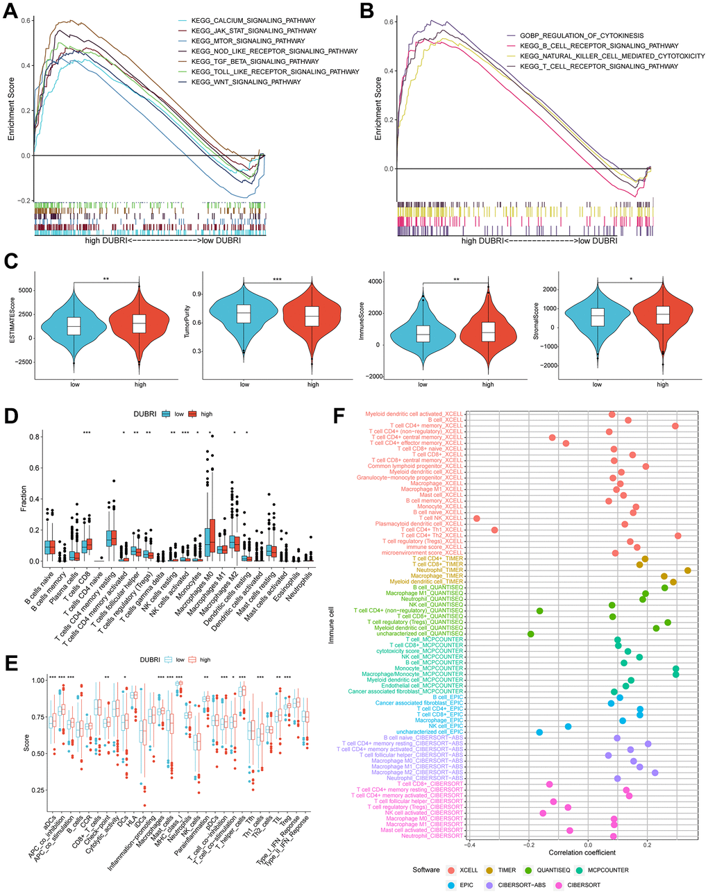 We used GSEA analysis on breast cancer sample data to examine the pathways in the high/low DUBRI group. The findings indicated that the WNT signaling pathway, CALCIUM, JAK_STAT, MTOR, nod like receptor, tgf beta, and toll like receptor were significantly enriched in the high DUBRI group (Figure 2A). The high DUBRI group were significantly enriched in the TME pathways of REGULATION_OF_CYTOKINESIS, B_CELL_RECEPTOR, NATURAL_KILLER_CELL, and T_CELL_RECEPTOR, which suggests that our high DUBRI group is closely related to the TMB is closely related (Figure 2B).