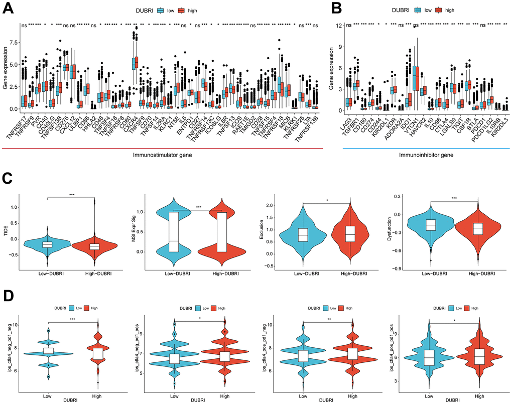We compared the expression levels of common immune checkpoints (immune-stimulating and immune-suppressing genes) between the high and low DUBRI groups in order to further investigate the relationship between DUBRI and the immune microenvironment. The findings demonstrated that the patients in the high DUBRI group had significantly higher expression levels of most immune checkpoints than those in the low DUBRI group (Figure 3A, 3B). By the above results of ESTIMATE analysis, the high DUBRI group had high immune infiltration characteristics.