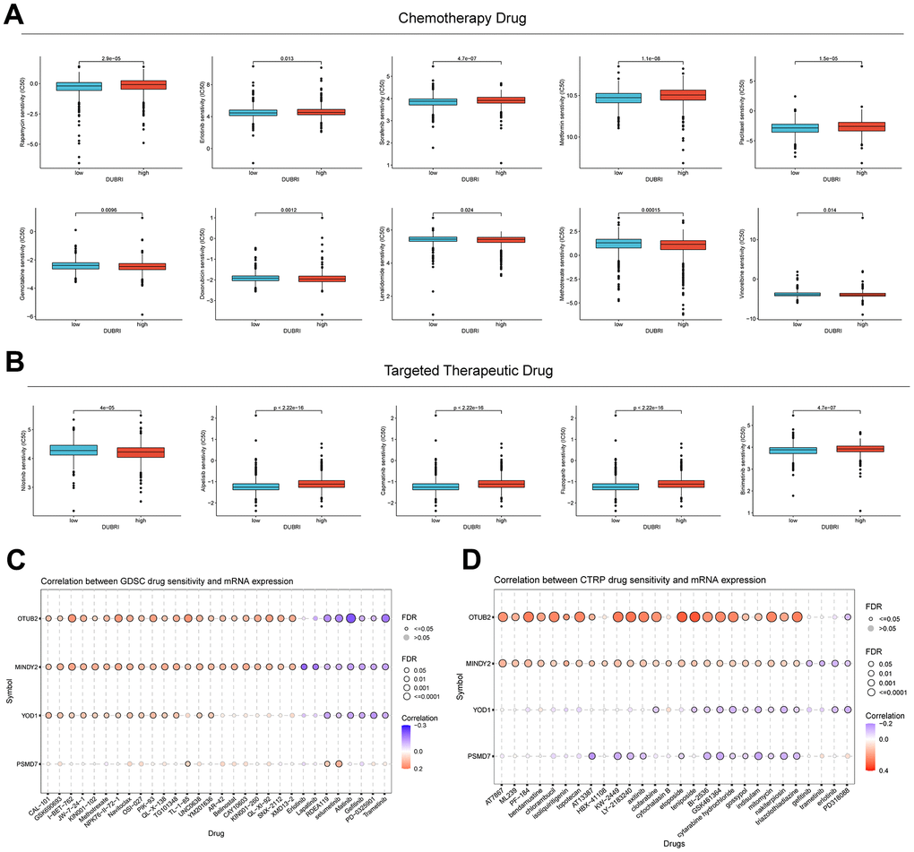In order to investigate the correlation between DUBRI and medication sensitivity, we determined the IC50 values of commonly used chemotherapeutic and targeted therapeutic drugs in breast cancer samples. We then compared these values across different DUBRI subgroups. We discovered notable variations in the chemotherapeutic and targeted therapeutic drugs used for breast cancer treatment across the high/low DUBRI groups. The IC50 values for Gemcitabine were much lower in the high DUBRI group compared to the low DUBRI group, indicating that patients in the high DUBRI group would exhibit a more favorable response to Gemcitabine-based chemotherapy. (Figure 4A, 4B). A positive correlation suggested that gene expression was linked to drug resistance, whereas a negative correlation indicated that gene expression was linked to drug sensitivity. The findings demonstrated a significant correlation between the expression of OTUB2 and MINDY2 genes with the majority of medication sensitivities (Figure 4C, 4D).