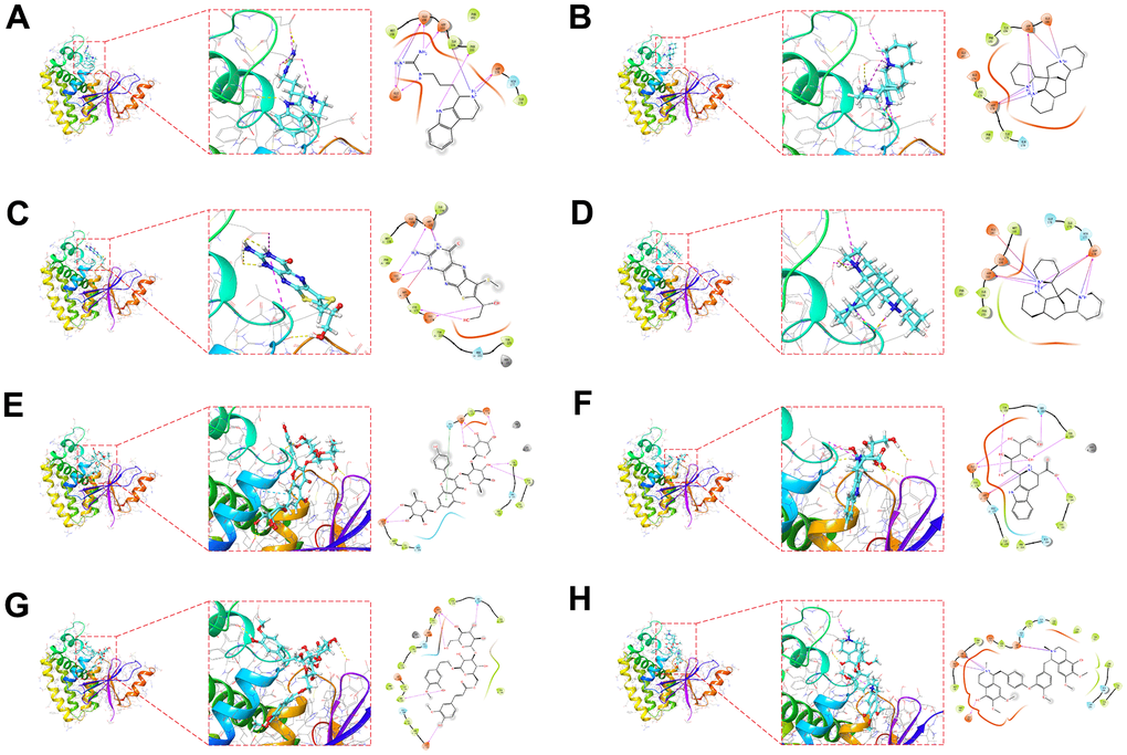 We obtained the protein structure of OTUB2 from the PDB database for molecular docking with small molecule compounds. The top eight small molecules (Trypargine, Ormosanine, Urothion, Piptanthine, Sagittatin A, Tetrahydropentoxyline, Scroside B, and Thalirugidine) with the highest binding affinity to the binding pocket of OTUB2 were shown (Figure 5A–5H). For example, Tetrahydropentoxyline forms hydrogen bonds with OTUB2 amino acid residues Glu-174, Asp-176, Tyr-195, Tyr-225, Ser-223, and Tyr-220, with Glu-174, Asp-176, Tyr-195, Tyr-225, and Ser-223 acting as the hydrogen bond acceptor and Tyr-220 as hydrogen bond donor. Scroside B forms hydrogen bonds with OTUB2 amino acid residues Glu-210, Phe-153, Glu-174, and Ser-223, wherein Glu-210, Phe-153, Glu-174, and Ser-223 act as hydrogen bond acceptors.