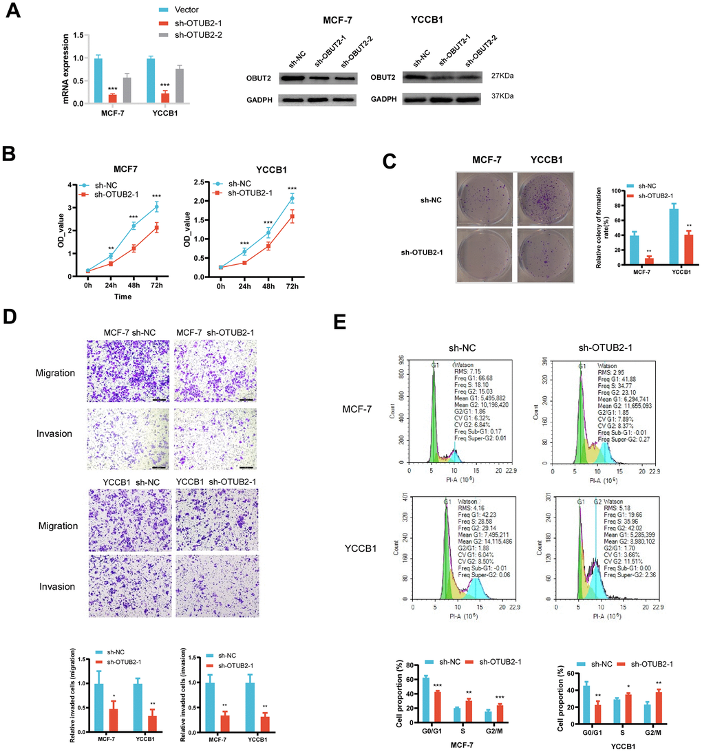 OTUB2 was knocked down by shRNA in MCF-7 and YCCB1 cells in vitro (Figure 6A). In the CCK8 experiment, the cell number was decreased in sh-OTUB2-1 group compared to the sh-NC group at 24h, 48h and 72h, indicating that the cell proliferation ability decreased after OTUB2 silencing (Figure 6B). In the clone formation experiment, knockdown of OTUB2 significantly reduced the clone formation ability in MCF-7 and YCCB1 cells (Figure 6C). In Transwell experiment, the OTUB2 silenced group showed a decrease in the number of cells penetrating to the lower chamber compared to the sh-NC group, which manifested OTUB2 silencing lead to a decrease in migration and invasion ability (Figure 6D). Finally, cell cycle detection revealed that the proportion of cells in G2/M and S phases was significantly higher in sh-OTUB2-1 group than that in sh-NC group, suggesting that cells were arrested in G2/M and S phases after OTUB2 silencing (Figure 6E).