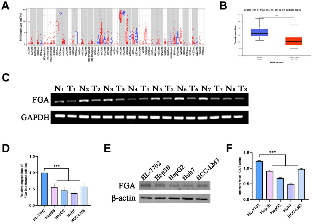 To investigate the role of FGA in HCC, through the TIMER database, we analyzed TCGA RNA-seq data and assessed the transcript levels of FGA in various human tumors. We observed that FGA expression was lower in liver carcinoma tissue. In addition, FGA was found to be under-expressed in bile duct carcinoma, lung squamous cell carcinoma, and kidney chromophobe tissue, while it was overexpressed in colon adenocarcinoma and rectal adenocarcinoma, indicating abnormal FGA expression across multiple types of tumors (Figure 1A). Furthermore, using UNCLAN data to evaluate FGA expression levels in hepatocellular carcinoma, we observed that FGA expression was significantly decreased in HCC compared to normal tissue (P < 0.001) (Figure 1B). Additionally, we collected 8 sets of clinical specimens, each set including cancer and adjacent tissue. We extracted RNA from all tissues, obtained PCR products, and conducted agarose gel electrophoresis experiments, yielding the same conclusions (Figure 1C). Meanwhile, we compared the FGA mRNA (Figure 1D) and protein expression (Figure 1E, 1F) between normal liver cell lines and liver cancer cell lines using RT-qPCR and Western blot methods, and found that the expression level of FGA in liver cancer cell lines was generally lower than that in normal liver cell lines, further confirming the differential expression of FGA. In summary, these results suggested that FGA expression is lower in hepatocellular carcinoma tissue compared to normal liver tissue.