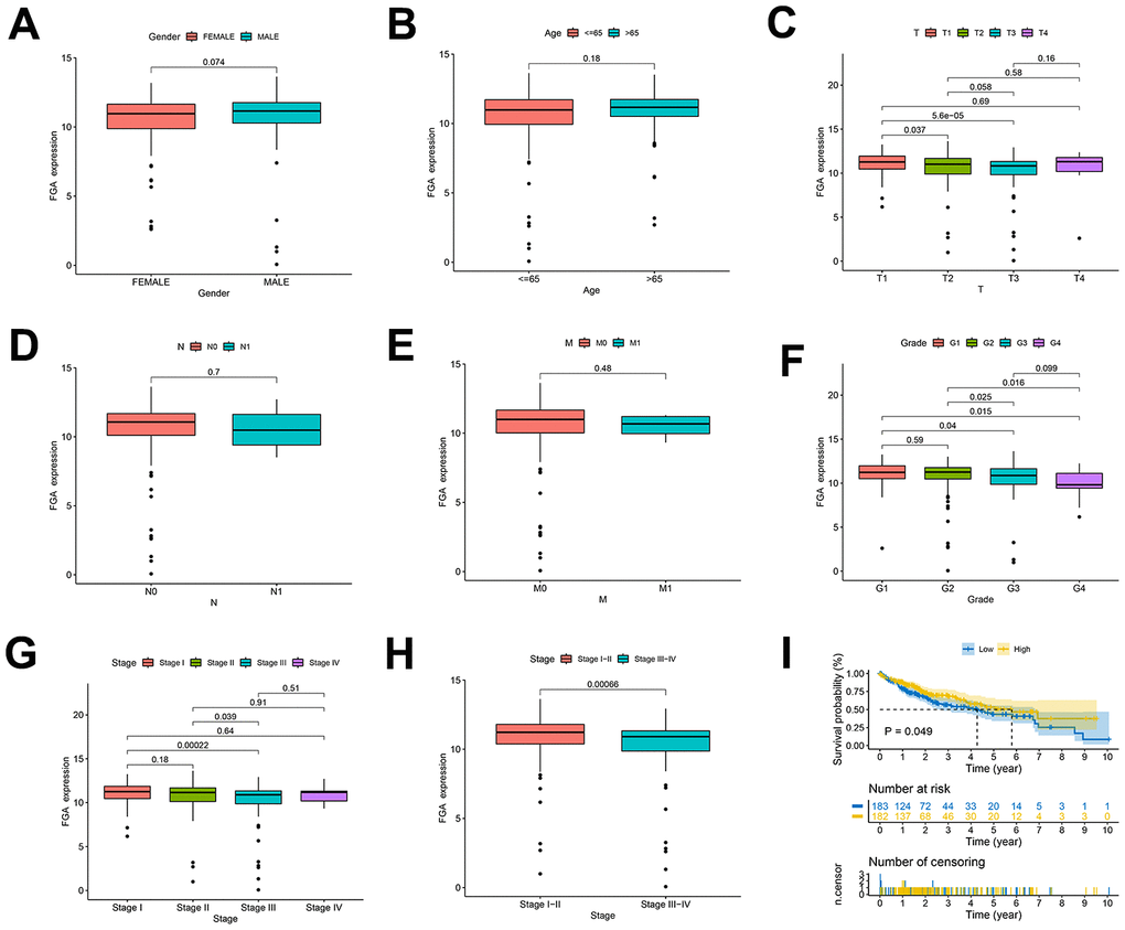 We conducted a study using TCGA data to investigate FGA characteristics in clinical and pathological aspects. These characteristics included gender, age, depth of infiltration, grade, and TNM stage, lymph node metastasis, distant metastasis. FGA mRNA expression showed no significant correlation with factors such as age (P = 0.18), gender (P = 0.074), lymph node metastasis (P = 0.7), or distant metastasis (P = 0.48) in HCC patients (Figure 2A, 2B, 2D, 2E). However, FGA mRNA expression was significantly correlated with depth of infiltration, grade, and TNM stage (Figure 2C, 2F–2H). There were differences in FGA mRNA expression among different stages of liver cancer, and when we divided liver cancer into early (I and II) and late (III and IV) stages, FGA mRNA expression was significantly lower in late-stage liver cancer, indicating that FGA undergoes significant changes with the progression of liver cancer (P = 0.00066) (Figure 2H). Furthermore, the analysis of the prognostic value of FGA mRNA expression in HCC revealed that lower levels of FGA mRNA expression were significantly associated with a shorter overall survival period (Figure 2I).
