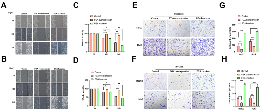 To investigate the relationship between FGA and the migratory and invasive behavior of HCC, we explored the effects of FGA on two HCC cell lines, HepG2 and Huh7, using a wound healing assay (Figure 3A, 3B). Each cell line was divided into three groups. When FGA was overexpressed, there was no significant reduction in the wound area (Figure 3C, 3D). However, when we compared the data from the three groups, we found that the wound area was significantly reduced in the FGA knockout group (P < 0.01). Because the wound healing assay cannot exclude the influence of cell proliferation factors, we also performed a Transwell migration/invasion assay (Figure 3E, 3F). By counting the number of cells in the lower chamber, we found that FGA overexpression significantly inhibited cell migration (Figure 3G). In the Transwell invasion assay, FGA knockout significantly promoted cell invasion efficiency (Figure 3H). Therefore, low expression of FGA can promote the malignant behavior of HCC.