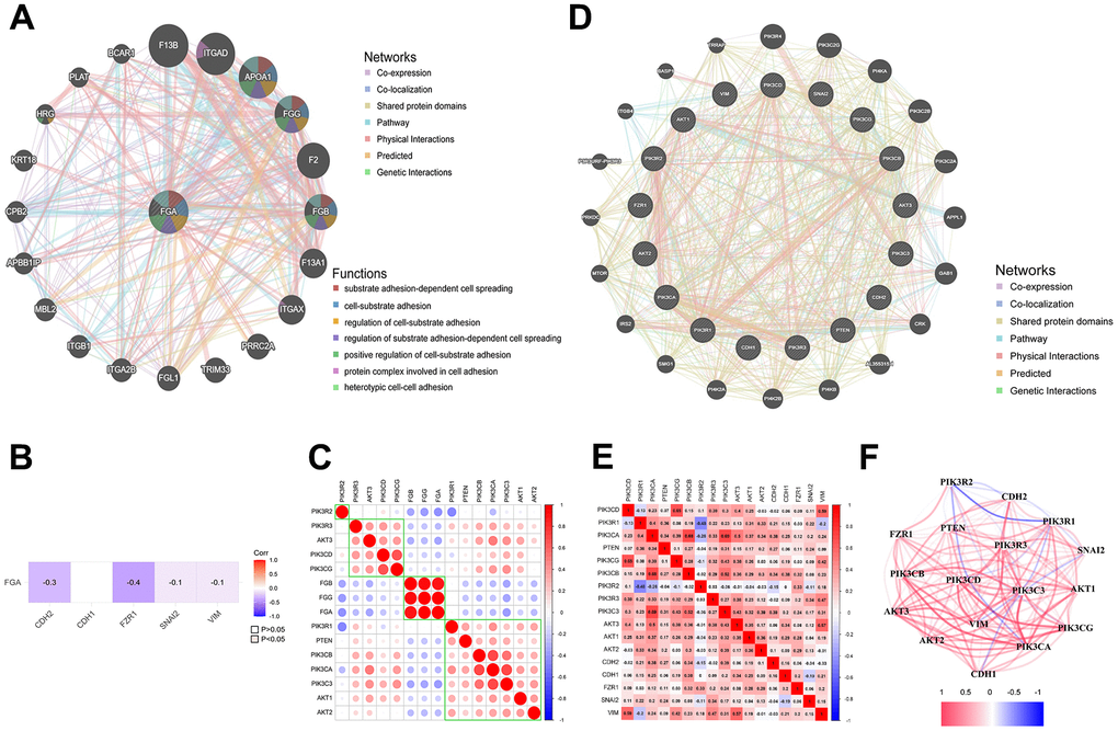 In order to explore the pathway through which FGA is involved in HCC metastasis, we analyzed the GeneMANIA database and found that FGA is associated with various cell signaling pathways, including cell-matrix adhesion and substrate adhesion-dependent cell spreading (Figure 4A). Abnormal expression of cell adhesion factors can confer tumor cells with migratory and invasive capabilities [27, 28]. The epithelial-mesenchymal transition (EMT) has a close relationship with malignant tumors, during which tumor cells gradually lose their epithelial cell-cell adhesion, promoting cancer progression [29]. Therefore, we analyzed the correlation between FGA and EMT-related marker protein (E-cadherin, N-cadherin, slug) in the TCGA database and found that FGA was negatively correlated with all of them (Figure 4B). It is reported that the PI3K/AKT pathway plays a crucial role in the progression of HCC [30, 31]. Through the analysis of the TCGA database, we found there was an association between FGA and the PI3K/AKT signaling pathway (Figure 4C). Using the GeneMANIA database and TCGA database, we identified the interaction and correlation between PI3K/AKT and E-cadherin, N-cadherin, and slug (Figure 4D–4F).