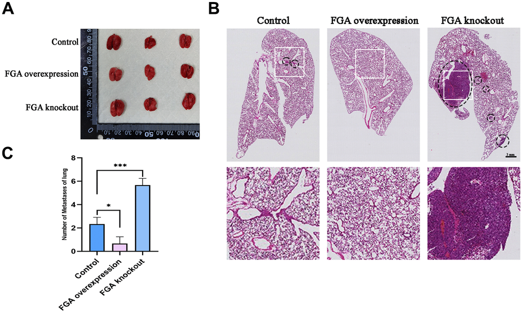 Wild-type, FGA knockout, and FGA overexpression HepG2 cells were resuspended in a 0.9% saline solution. The mice (4 weeks of age, immunodeficient BALB/c nude mice) were injected with 3.0 × 10 ^ 5 cells in the liver. The mice were euthanized after 4 weeks, and their lung lobes were analyzed with hematoxylin and eosin (H/E) staining.