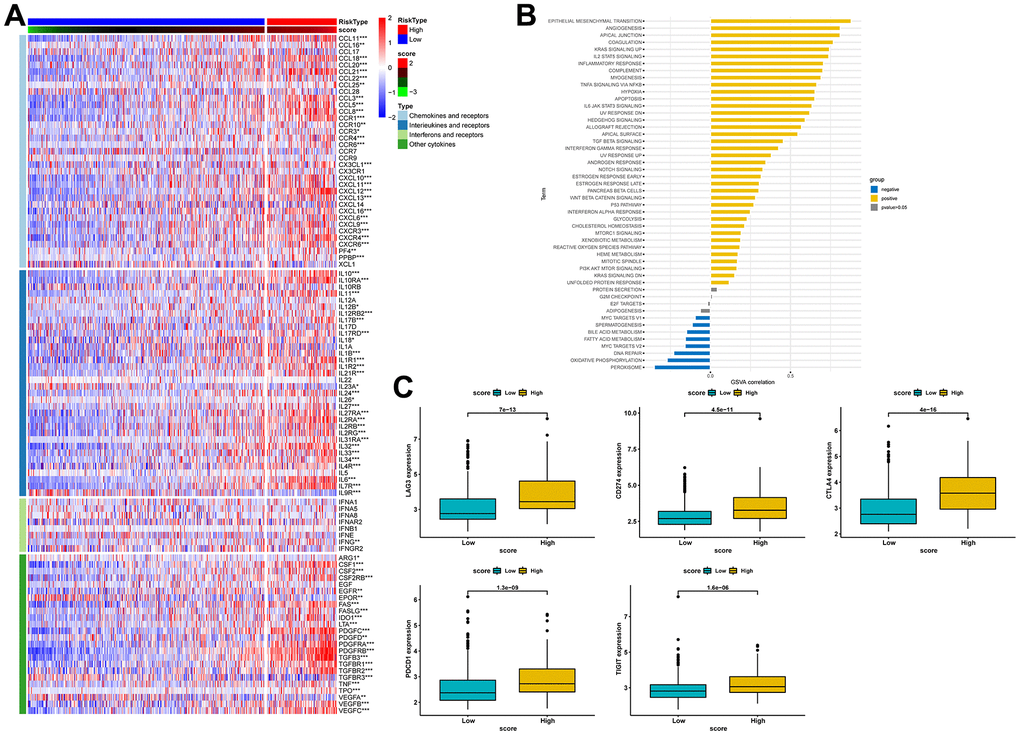 Our comprehensive investigation into the relationship between the prognostic signature and the tumor immune microenvironment revealed a positive correlation between the risk score and the infiltration of multiple immune cells, including MDSC, NK cells, and Treg cells. While cytotoxic T cells are critical effector molecules in anti-tumor immunity, CAFs and Treg cells can create immunologic barriers that lead to cytotoxic T cell dysfunction or exhaustion during cancer progression [43, 44]. This suggests that patients in the high-score group may experience reduced anti-tumor activity. Further analysis showed that patients in the high-score group had significantly elevated levels of chemokine expression. The role of chemokines in the tumor immune response is bidirectional. Pro-tumorigenic immune cells can recruit immunosuppressive cells via chemokine-dependent infiltration at different tumorigenesis stages and immune cell activation states, thereby reinforcing pro-tumorigenic responses [45]. This phenomenon may partially contribute to the observed immunosuppression in the high-score group.
