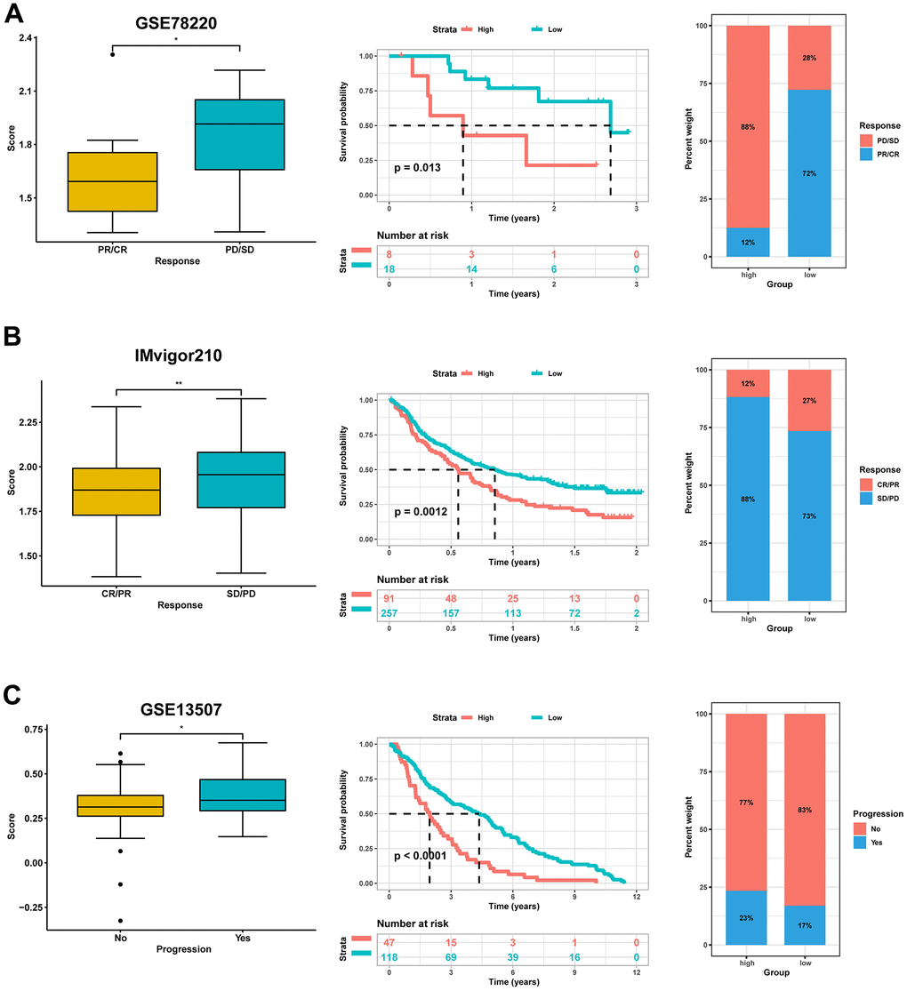 Similarly, our comparative analysis revealed that the expression levels of five immune checkpoints, LAG3, CD274, CTLA4, PDCD1, and TIGIT, were significantly elevated in the high-score group (p<0.001) (Figure 10C). Collectively, these results demonstrated that the risk score was associated with the immunotherapy response in BLCA patients. To further substantiate this finding, we investigated the predictive value of the risk score by assigning patients in the GSE13507, GSE78220, and IMvigor210 cohorts to low-risk and high-risk groups. The risk score was found to have predictive value for immune checkpoint inhibitors. It was observed that patients who responded to anti-PD1, anti-PDL1, and intravesical BCG immunotherapy had distinctly lower risk scores. In contrast, patients in the high-score group had significantly worse objective response rates to immunotherapy and were more inclined to poorer survival outcomes (p < 0.05). Additionally, we found that patients with high-score had a higher incidence of tumor progression compared to patients with low-score (Figure 11A–11C). Taken together, these findings strongly suggest that the risk score may serve as a promising marker for immunotherapy in BLCA patients, potentially determining a specific immune profile. Patients in the high-score group are more likely to tolerate immunotherapy.