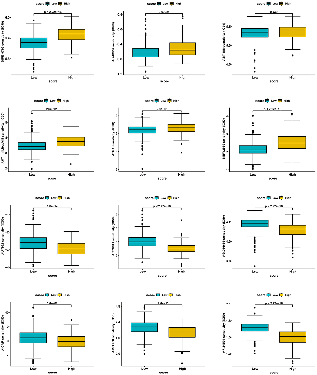 To investigate potential treatment options for immunotherapy-insensitive patients, we directed our attention toward targeted therapies. We estimated the 50% maximum inhibitory concentration (IC50) of each sample to multiple anti-cancer drugs using the R package “pRRophetic” [29]. We then compared the differences in IC50 values between the high- and low-score groups, where a higher IC50 value implies lower sensitivity to treatment.