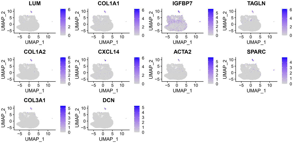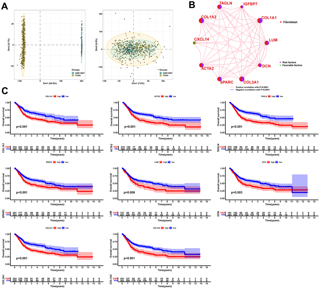 After filtering the scRNA-seq data, we obtained information on the range of detected gene numbers, the number of transcripts sequenced, the percentage of mitochondrial/ribosomal/hemoglobin content in each sample, and the top 25 genes with the highest rate (Supplementary Figure 1). After reducing the dimensions, we identified 18 clusters and annotated them into five core cell types: T cells, malignant cells, monocytes, macrophages, fibroblasts, and endothelial cells. 21160 genes and 36532 cells were used for further analysis (Figure 1A). Notably, cluster 13 was defined as a fibroblast subpopulation. Figure 1B depicts the number of cells in each cell type, where the fibroblast subpopulation consists of 249 cells. Differential gene expression analysis was conducted for each cell type, and Figure 1C illustrates the top 5 up and down-regulated genes in each cell type. A detailed list of differential genes is provided in Supplementary Table 2. Among the fibroblast marker genes, we selected the top 10 differentially expressed genes, namely LUM, COL1A1, IGFBP7, TAGLN, COL1A2, CXCL14, ACTA2, SPARC, COL3A1, and DCN, and visualized their expression patterns in cells using “FeaturePlot” (Figure 2). Additionally, we observed a positive correlation between these marker genes (p<0.0001), and the results of univariate regression analysis revealed that all nine marker genes, except for CXCL14, were prognostic risk factors (Figure 3B). Following batch effect removal, the TCGA-BLCA and GSE13507 datasets were combined as the testing set, which comprised 17147 genes and 576 samples (Figure 3A). The testing set was divided into gene high- and low-expression groups according to the best cutoff value, and our analysis demonstrated that the OS of BLCA patients was significantly worse (p<0.05) in the high-expression group of the majority of marker genes (Figure 3C).