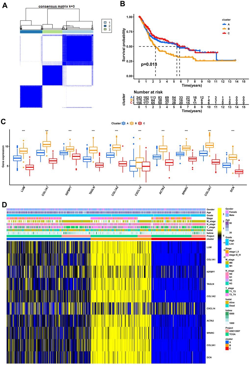 Based on ten fibroblast marker genes, consensus clustering analysis was performed on the samples of the testing set with the R package “ConsensusClusterPlus” [24] to identify fibroblast subtypes. To ensure the stability of the clustering process, we employed a resampling rate of 80% and 1000 repeats. Subsequently, we selected cluster-effective results as the subtypes of BLCA patients based on survival analysis and differential expression of marker genes.