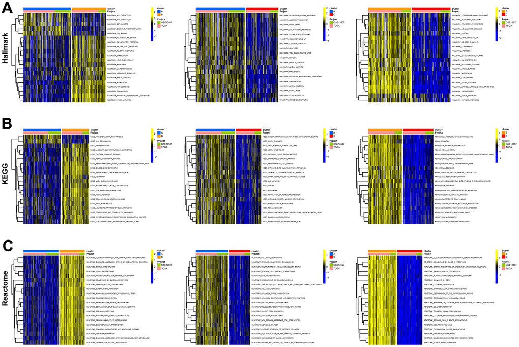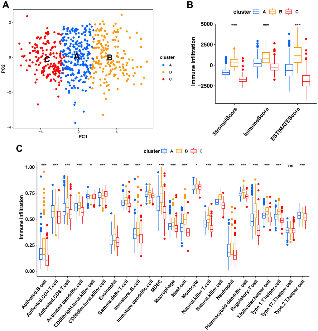 Consensus clustering analysis revealed the presence of three subtypes based on the expression levels of marker genes (Figure 4A). Kaplan-Meier survival analysis demonstrated that the median OS of patients in cluster B was substantially lower than the other two subtypes (p=0.018) (Figure 4B). Figure 4C shows the comparison of gene expression levels among the three subtypes, where cluster B had the highest expression levels of all marker genes, followed by cluster A (p<0.001). The distribution of the remaining clinical features in the three subtypes is shown in Figure 4D. We further performed pathway enrichment analysis for each subtype and found that cluster B was mainly enriched in immune, metabolic, and tumorigenesis-related pathways (Figure 5A–5C). Afterwards, we investigated the correlation between each subtype and the immune microenvironment by using the ESTIMATE algorithm. The results revealed that the stromal score, immune score, and estimated score of cluster B exhibited significantly higher values than those of the other two groups. (p<0.001) (Figure 6A, 6B). The results of the ssGSEA algorithm were similar and indicated that the infiltration level of most immune cells was higher in cluster B, with Monocyte, Myeloid-derived suppressor cells (MDSC), and T cells being the major immune cell types (Figure 6C).