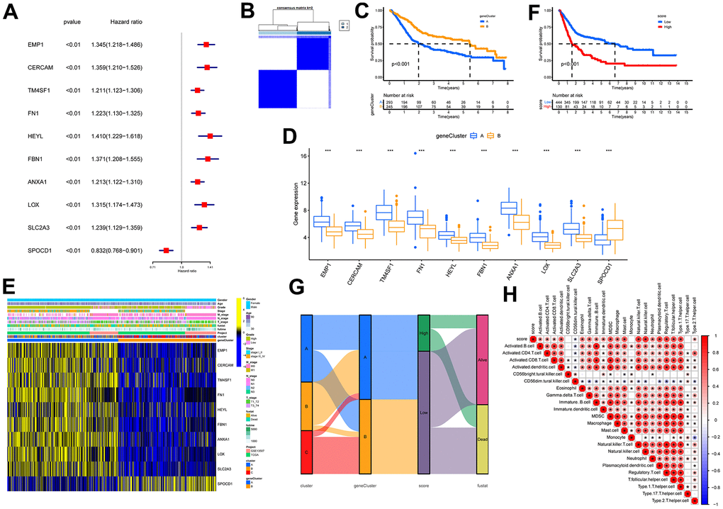 A total of 723 DEGs were identified through a conjunction set following differential analysis among the subtypes (Figure 7A). Subsequently, GO/KEGG enrichment analysis revealed their association with an extracellular matrix structure, leukocyte migration, PI3K-Akt signaling pathway, and other functions (Figure 7B–7D). To detect prognosis-related genes, we performed univariate regression analysis and selected the top 10 genes with the smallest p-values as signature genes: EMP1, CERCAM, TM4SF1, FN1, HEYL, FBN1, ANXA1, LOX, SLC2A3, and SPOCD1. Among them, all but SPOCD1 were identified as prognostic risk factors (Figure 8A). Based on the signature genes, we classified the patients into two molecular subtypes (Figure 8B). Survival analysis revealed a significantly worse prognosis in patients belonging to gene cluster A (p<0.001) (Figure 8C), who also exhibited higher expression levels of signature genes (p<0.001). Furthermore, we compared the rest of the clinical characteristics (Figure 8D, 8E). We established a prognostic signature to comprehensively capture the differences between the two molecular subtypes. We calculated the signature scores through GSVA and divided the testing set samples into high- and low-score groups based on the optimal cutoff value. The median OS of patients in the high-score group was significantly lower than that of the low-score group (p<0.001) (Figure 8F). In repeated subgroup analysis, we observed that all patients in the high-score group belonged to the gene cluster A subtype, while most patients in the low-score group were in survival status. This indicates that the prognostic signature has good predictive value in BLCA (Figure 8G). Moreover, we found a significant positive correlation between risk score and multiple immune cell infiltrations (p<0.05), particularly MDSC, NKT cell, NK cell, and Treg cell (Figure 8H).