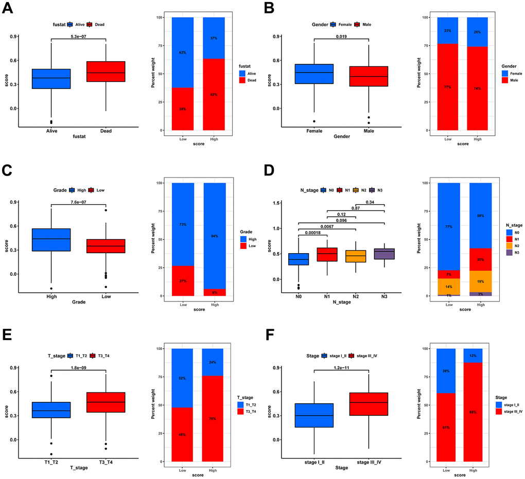 The clinical characteristics of the tumor are of significant importance in determining its prognosis. Therefore, we evaluated the predictive capacity of the prognostic signature in patients exhibiting disparate states, genders, grades, N stages, T stages, and stages, by contrasting the discrepancies in clinical characteristics between high- and low-risk groups. Significant differences in risk scores were observed among all subgroups based on clinical characteristics, as illustrated in Figures 9A–9F. (p < 0.05). Moreover, the proportions of patients with death, high-grade, lymph node metastasis, T3/4, and stage III/IV were substantially higher in the high-score group than in the low-score group. Hence, it is suggested that risk scores have excellent predictive potential for clinical outcomes.