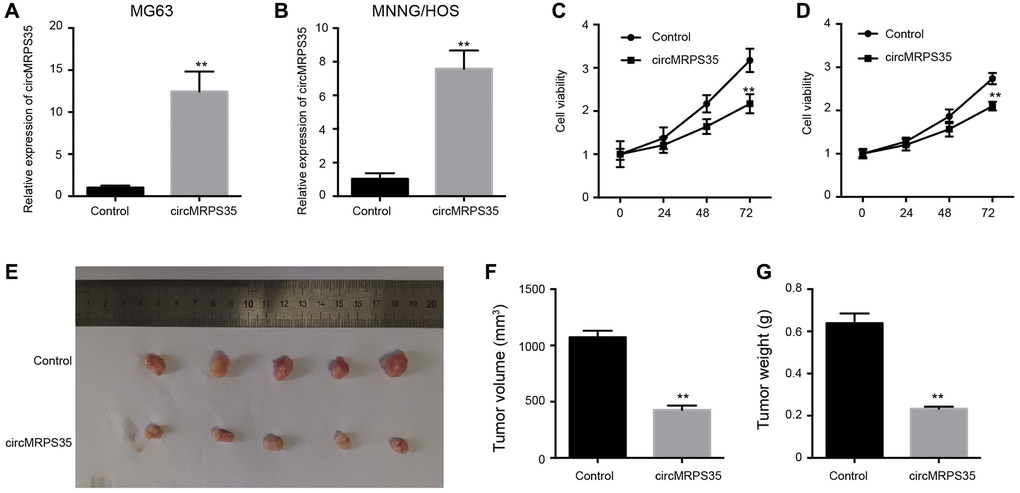 To investigate the effect of circMRPS35 on OS, MG63 and MNNG/HOS cells were treated with a circMRPS35 overexpression plasmid. Successful overexpression of circMRPS35 in MG63 and MNNG/HOS cells was confirmed (Figure 1A, 1B), and it was found to diminish the viability of both MG63 and MNNG/HOS cells (Figure 1C, 1D). It also significantly inhibited tumor growth in OS cells in vivo (Figure 1E–1G).