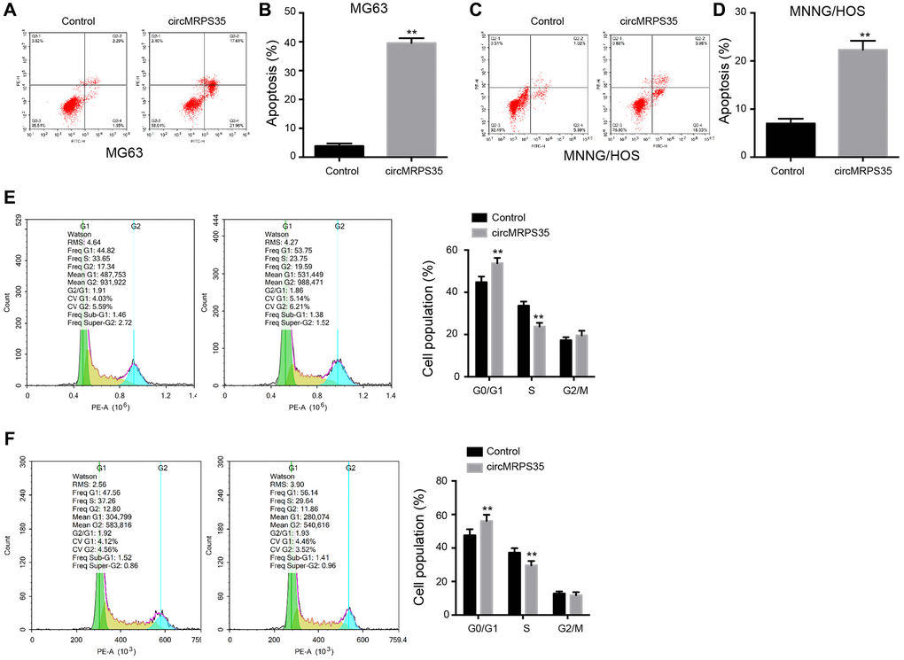 We investigated the role of circMRPS35 in modulating apoptosis and cell cycle in MG63 and MNNG/HOS cells. Overexpression of circMRPS35 increased the apoptosis rate in both MG63 and MNNG/HOS cells (Figure 2A–2D). Concurrently, it also resulted in an increased proportion of MG63 and MNNG/HOS cells in the G0/G1 phase, whereas the S phase cell population was reduced (Figure 2E, 2F).