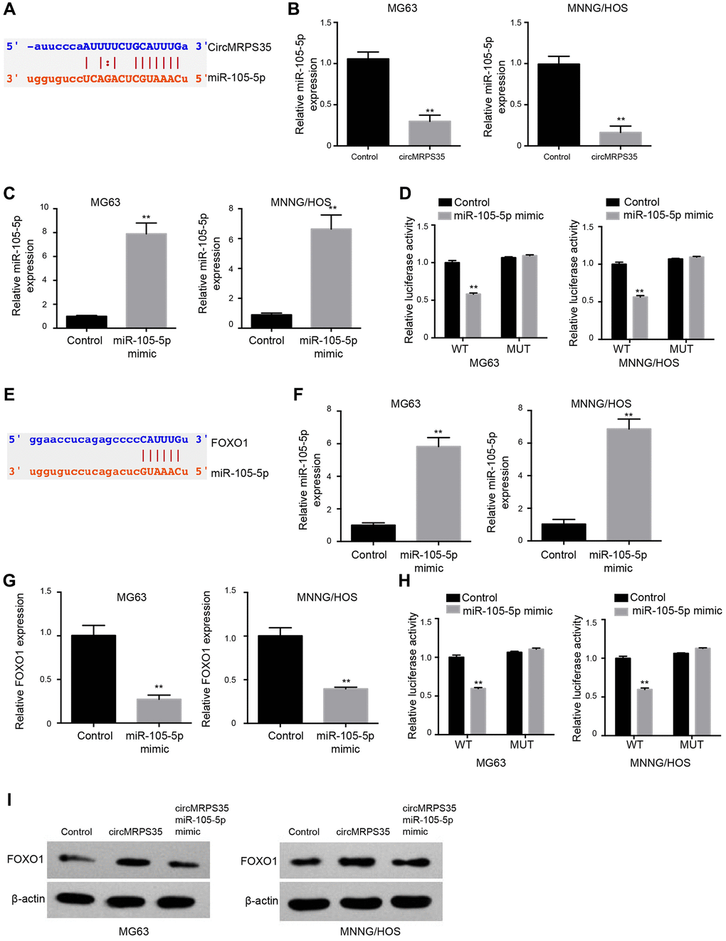 Subsequently, we explored the potential interaction between FOXO1 and miR-105-5p via bioinformatics analysis (Figure 3E). Treatment with miR-105-5p mimic induced miR-105-5p (Figure 3F) expression, whereas it repressed FOXO1 expression (Figure 3G). In MG63 and MNNG/HOS cells, the luciferase activity associated with FOXO1 was suppressed by the miR-105-5p mimic (Figure 3H). Overexpression of circMRPS35 enhanced FOXO1 protein levels, but this effect was reversed by co-treatment with the miR-105-5p mimic in both MG63 and MNNG/HOS cells (Figure 3I).