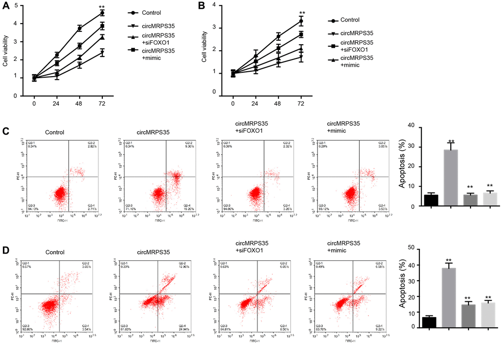 We identified that circMRPS35 overexpression suppressed MG63 and MNNG/HOS cell viability; however, this effect was reversed by either FOXO1 inhibition or the miR-105-5p mimic (Figure 4A, 4B). Additionally, circMRPS35 induced apoptosis in MG63 and MNNG/HOS cells, an effect that was obstructed by FOXO1 knockdown or the miR-105-5p mimic (Figure 4C, 4D).