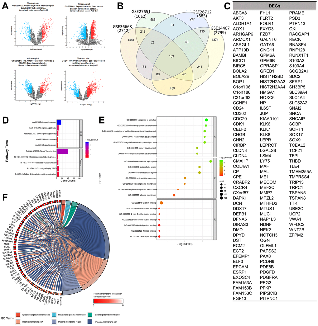 The selected gene set enrichments (GSEs), namely GSE36668 [9], GSE27651 [10], GSE26712 [11, 12], and GSE14407 [13], were microarray datasets from OC patient samples, and a detailed profile of the datasets is provided in Table 1. Based on a log [fold change (FC)] cutoff of > 1.5 and a p-value of < 0.5, the gene distribution of the sample is clearly visible on the left and right of the volcano plot to ensure the significance of their expressions in the sample. Based on a Venn analysis, it was found that the numbers of unique genes from the GSEs were sequentially 1484, 586, 297, and 1374 genes, and 153 genes, which were DEGs, were expressed in all four GSEs (Figure 1A–1C). Furthermore, results of the gene ontology (GO) term and pathway analysis of DEGs showed a high confidence score (false discovery rate; FDR) for GO biological processes (BPs) and cellular components (CCs) and a low confidence score for GO molecular functions (MFs). GO terms that involved the most GSEs were GO:0005515-protein binding (125 genes: p < 0.001), GO:0050896-response to stimulus (102 genes: p < 0.0001), and GO:0005886-plasma membrane (60 genes: p < 0.001). Based on the results of this analysis, it can be seen that expressed proteins were dominated by those located in plasma membranes and played roles in responding to stimuli, including binding between proteins. Furthermore, the pathway analysis of DEGs showed a relatively low average confidence score (p-value). The induced pathways with the highest confidence scores (p < 0.0001) were hsa05200: Pathways in Cancer (KEGG: 16 genes) and R-HSA-162582: Signal Transduction (Reactome: 40 genes). Based on the top pathway that was induced in general, it is known that several DEGs act as oncogenes, which can be seen from the term-related pathways to cancer, especially in the Wnt and Janus kinase (JAK)-signal transduction and activator of transcription (STAT) signaling pathways (Figure 1D, 1E).