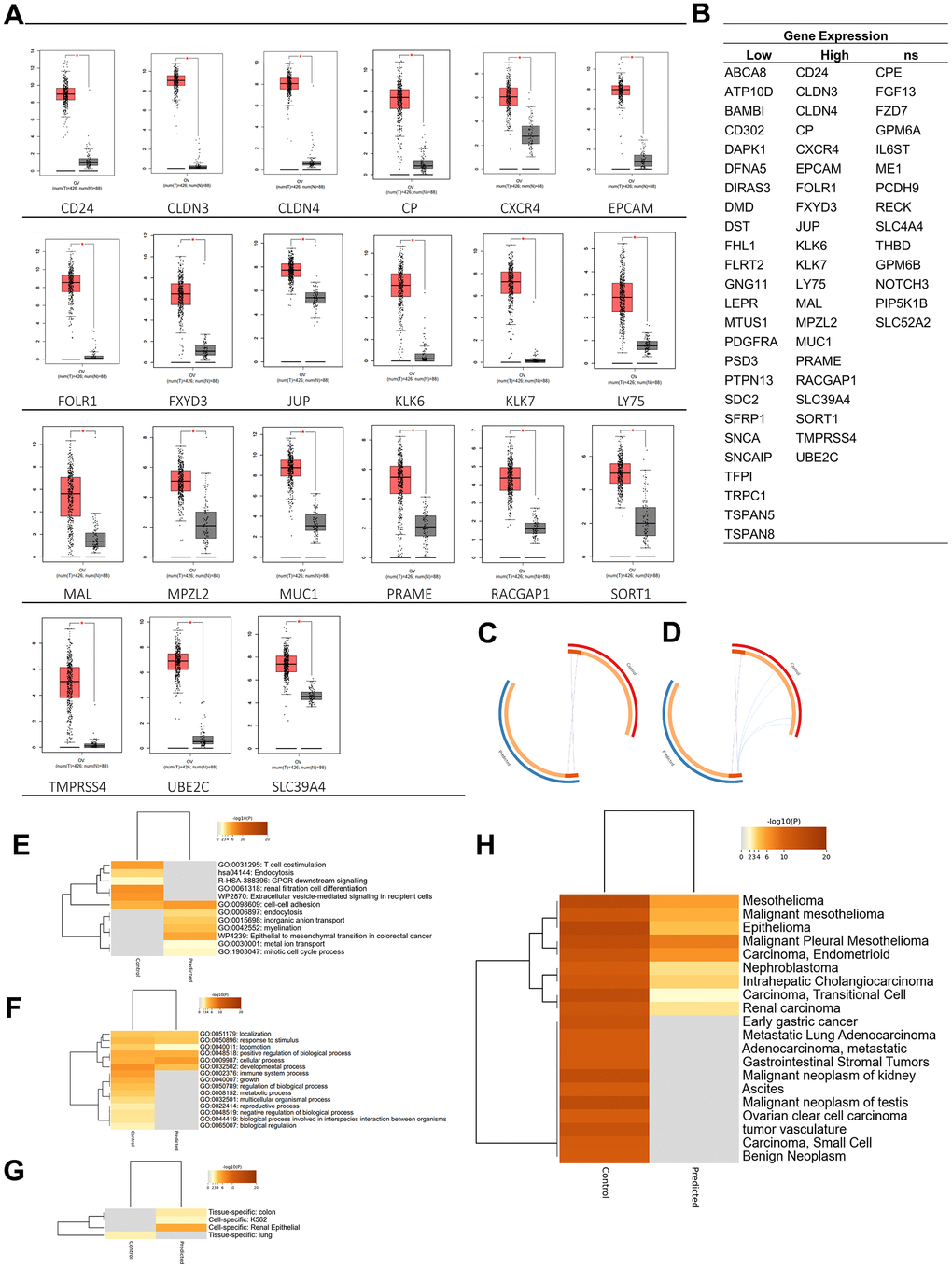 Additionally, based on a disease-related gene analysis result, it was found that the control gene was related to the top 20 diseases by confidence scores, compared to the predicted gene, which was only predicted to be related to nine diseases. Based on the confidence scores, C1368683: epithelioma, C0025500: mesothelioma, and C0007138: carcinoma, was the disease with the highest confidence score, where genes in both groups were predicted to play roles in the disease. In addition, the control gene was only expressed (p < 0.05) in lung (PGB:00018). In contrast, the predicted gene was expressed (p < 0.05) in renal epithelial (PGB:00119), colon tissue (PGB:00007), and K562 cell line [25], which are lymphoblast cells isolated from the bone marrow of a 53-year-old chronic myelogenous leukemia patient (Figure 2G, 2H).