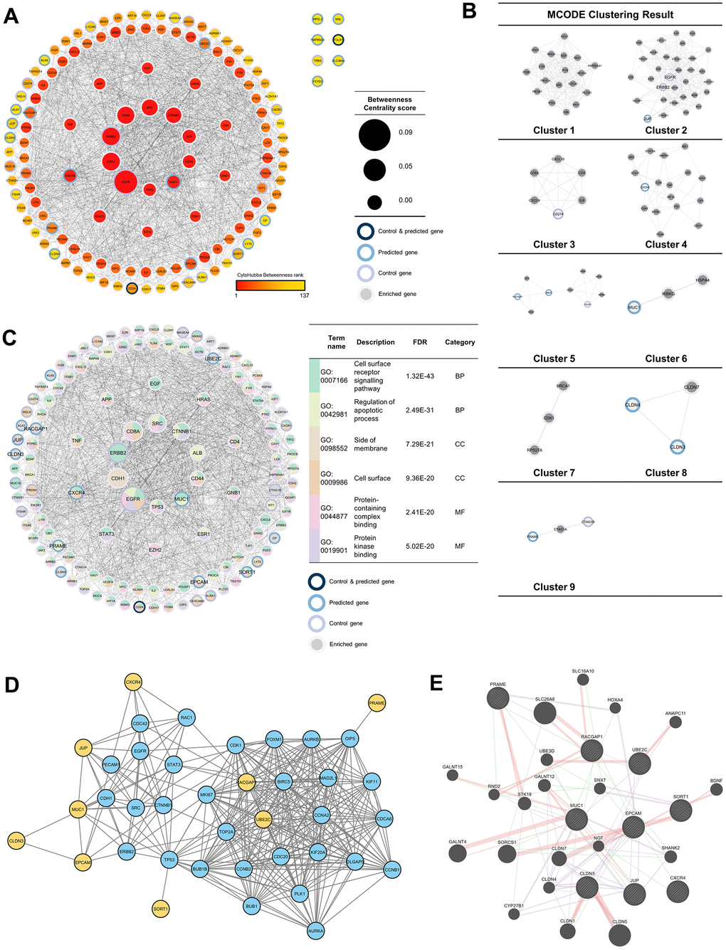 To discover more pathways that the 37 genes may induce, a network was built by adding 100 neighboring genes as enriched genes. The PPI network analysis was used because it was proven to be a valuable tool in enhancing the efficacy of CAR T cell therapy by providing insights into critical protein interactions [26], optimizing T cell functions [27], and identifying potential therapeutic targets [28]. Based on the network formed, it was found that EGFR and ERBB2 were genes with the highest betweenness-centrality scores in the control group, while MUC1 and CXCR4 were genes with the highest betweenness-centrality scores among predicted genes. In addition to those two genes, EPCAM, RACGAP1, UBE2C, PRAME, SORT1, JUP, and CLDN3 sequentially had the top seven betweenness-centrality scores. Based on MCODE clustering, it was found that there were nine clusters in the main network. Some of the predicted genes in the cluster included JUP (cluster 2), CXCR4 (cluster 4), RSCGAP1 and UBE2C (cluster 5), MUC1 (cluster 6), CLDN3, and CLDN4 (cluster 8) (Figure 3A, 3B). Furthermore, GO and pathway analyses were also carried out to evaluate which bioactivities and pathways were associated with this network. Based on the GO analysis, the top two from each GO category are shown in Figure 3C. At the same time, MUC1, CXCR4, EPCAM, RACGAP1, UBE2C, PRAME, SORT1, JUP, and CLDN3 were labeled as the recommendation of tumor-associated antigens (TAAr) in a subsequent analysis.