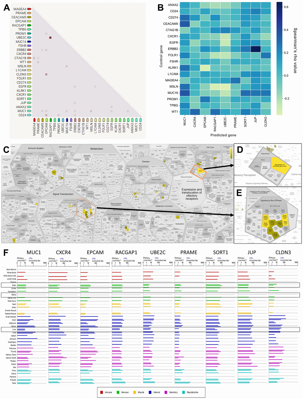 Furthermore, to further explore the TAAr genes, co-expression and correlation analyses were carried out on control genes; this analysis was carried out to see relationships between gene expressions that occurred. Based on a STRING co-expression analysis in Homo sapiens (cutoff, high confidence: 0.7), it was found that several TAAr genes were co-expressed with control genes. The top five co-expression scores were for RACGAP1-UBE2C, CLDN3-EPCAM, CD24-EPCAM, CTAG1B-MAGEA4, and MSLN-MUC1. Then, a correlation analysis was performed to explore correlations of TAAr with control genes specific to the OC sample. TAAr interactions with control genes with the highest positive correlation scores were JUP-ERBB2, MUC1-MUC16, MUC1-CEACAM5, CXCR4-WY1, and SORT1-MUC16. In contrast, interactions with the lowest negative correlation scores were UBE2C-MSLN, EPCAM-KLRK1, RACGAP1-MSLN, UBE2C-EGFR, and UBE2C-CXCR1 (Figure 4A, 4B).